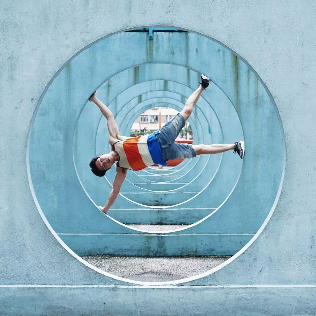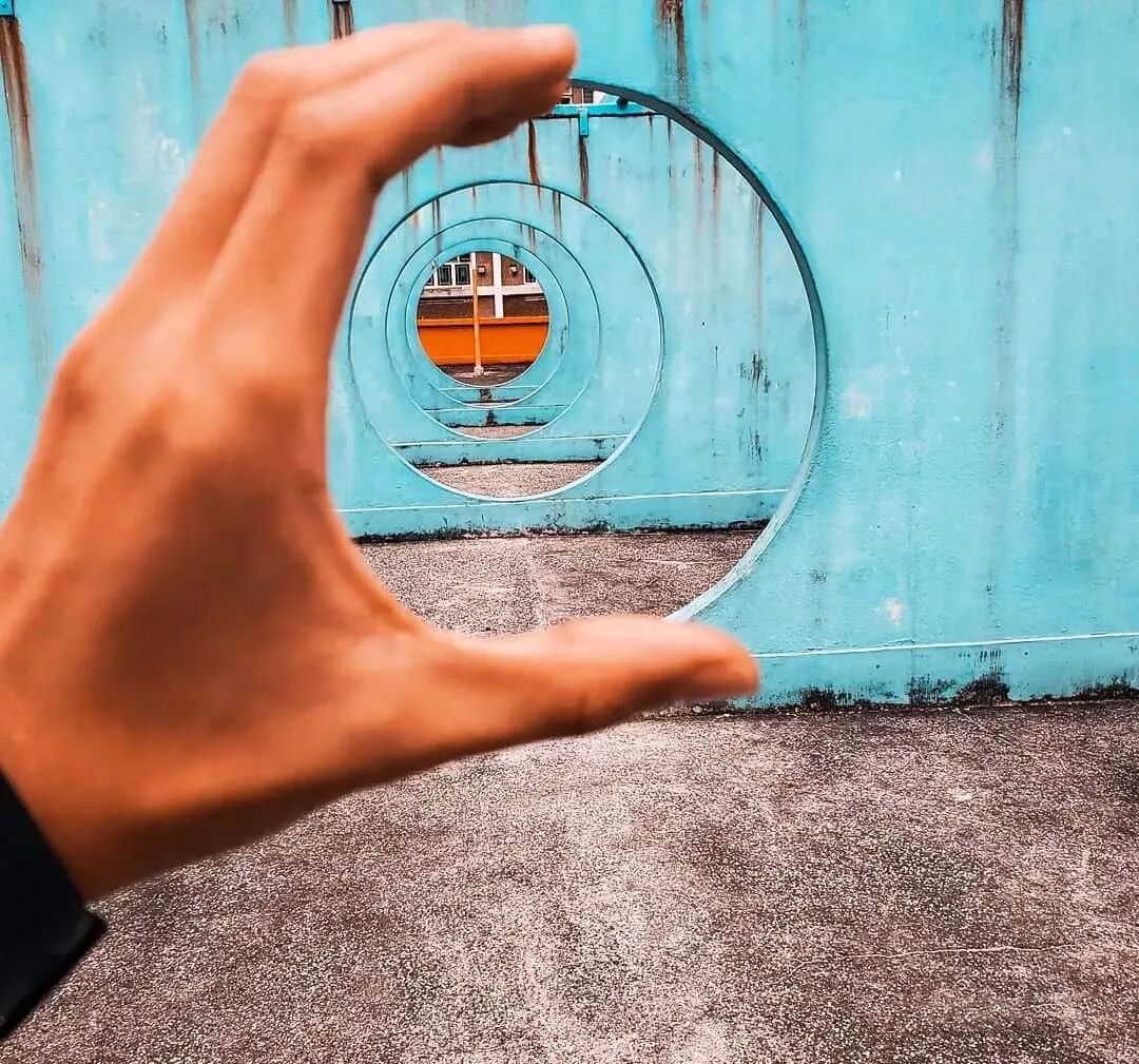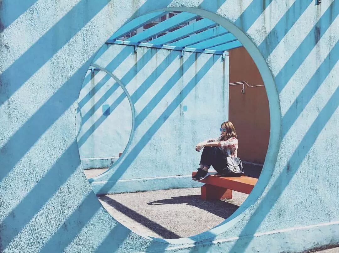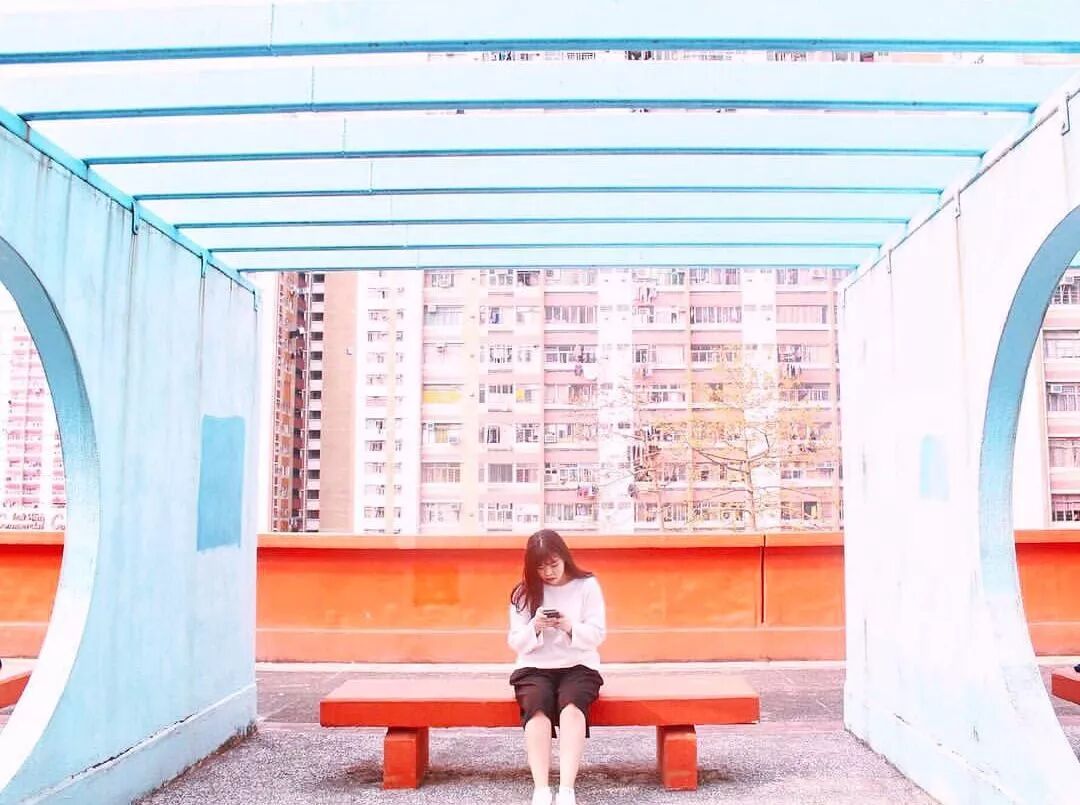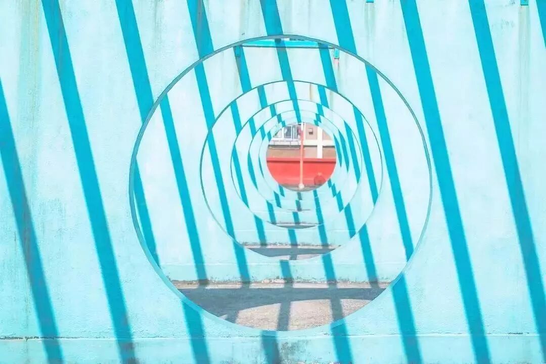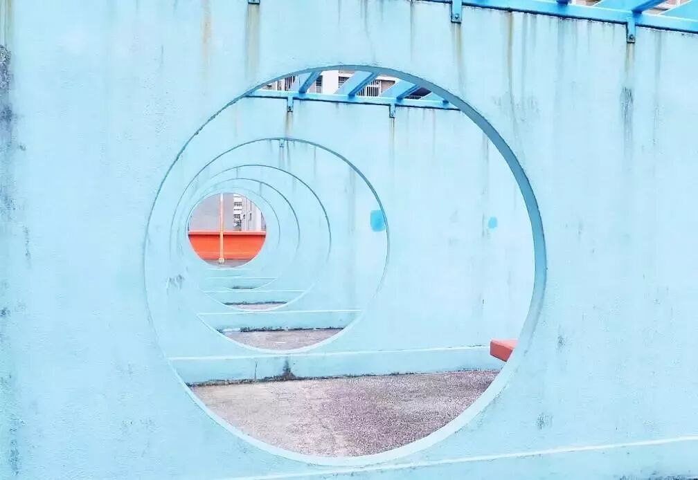 而就在这个历史有点久远的普通屋邨里,却藏着一个“蓝色秘境”。七面天蓝色的墙并排在一起,每面墙中间都有一个空心圆,从不同角度观看这些蓝色圈圈,像通向梦幻世界的神秘隧道。墙的固定距离,让圆圈形成一线,浅蓝色的重迭圈圈很有艺术气息。