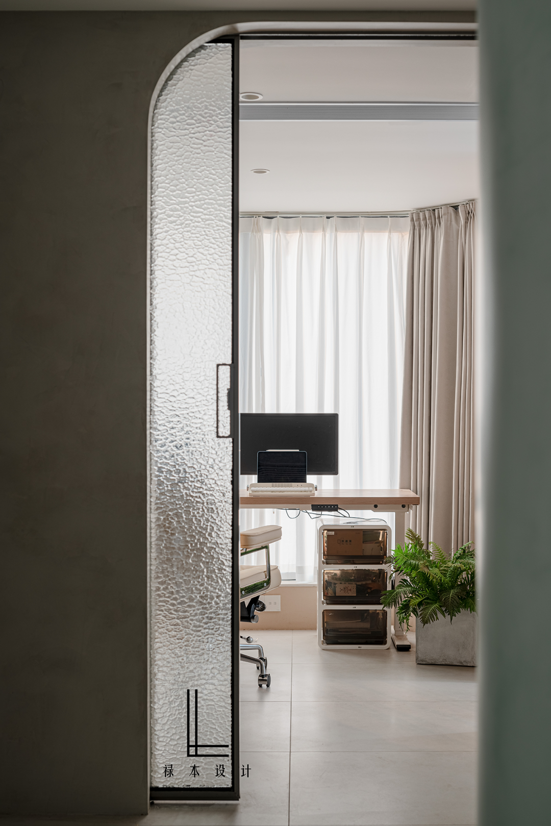 餐厨区多彩的烟火气息,蛋壳青的内嵌冰箱,原木餐边柜,艺术漆制作的水磨石纹理餐桌腿,俏皮的抽屉柜,各式可爱的绿植等等,让餐厨区的徐徐生动的居家宝藏。弧形的设计削弱了柜体的厚重感,增加了空间观赏性和视野的无边际感,俏皮的颜色也装点了空间的气质。
