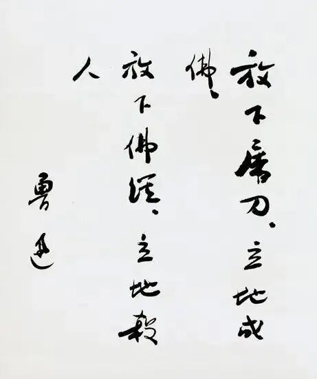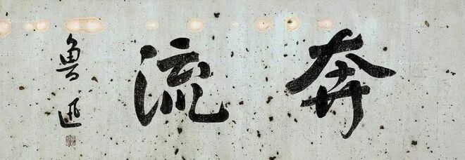 鲁迅的两个作品。第一幅作品写的是奔流。意为水流得很急、流得很急的水流。难得一见的大字,奔放洒脱。第二幅字写的是放下屠刀,立地成佛;放下佛经,立地杀人。这幅字韵致高古。