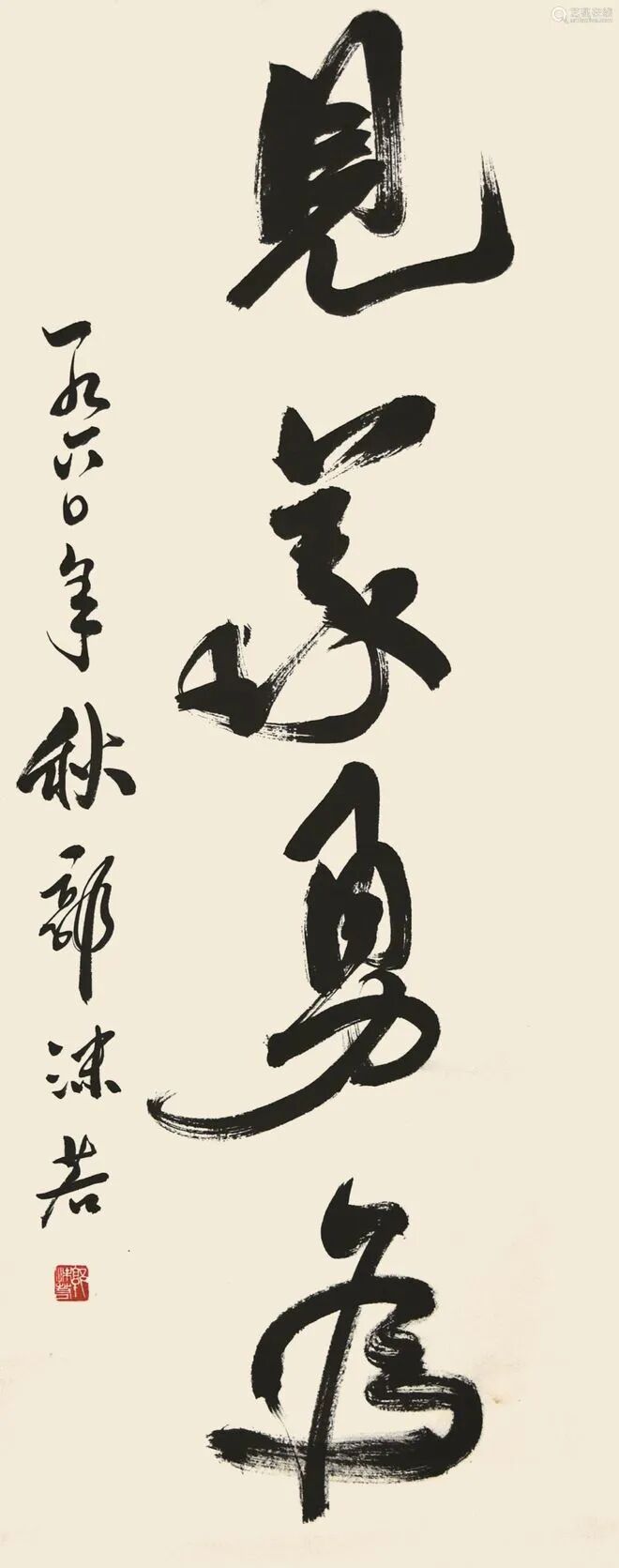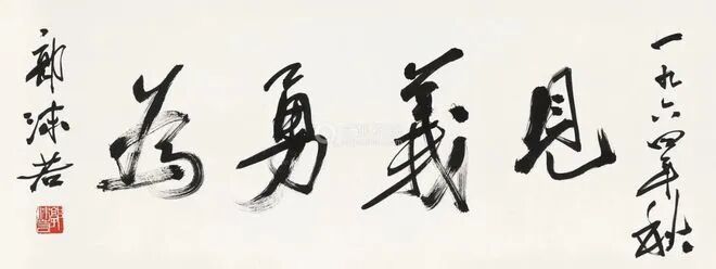 郭沫若的两个作品见义勇为。意思是指个人不顾自身安危通过同违法犯罪行为作斗争或者抢险、救灾、救人等方式保护国家、集体的利益和他人的人身、财产安全的一种行为。这两幅字奇崛诡异,气势雄健。