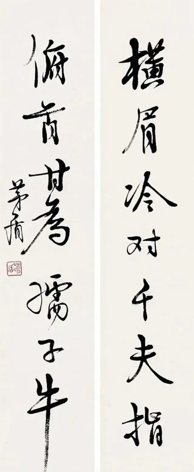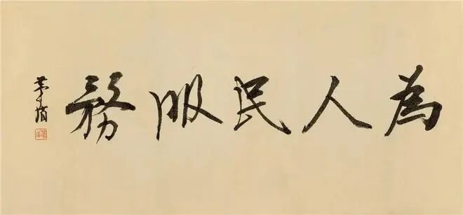 茅盾的两个作品。第一幅字写的是为人民服务。第二字写的是横眉冷对千夫指,俯首甘为孺子牛。他的字线条劲道,瘦劲刚健。