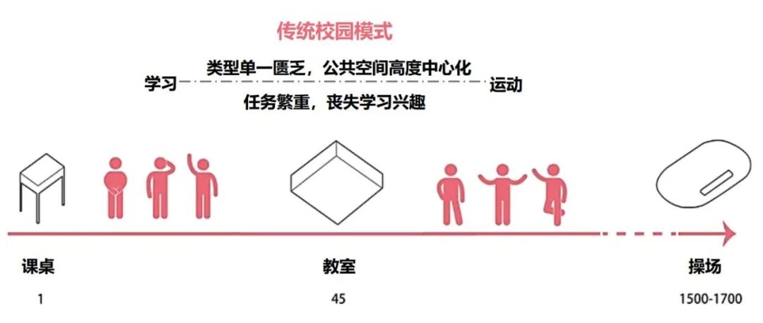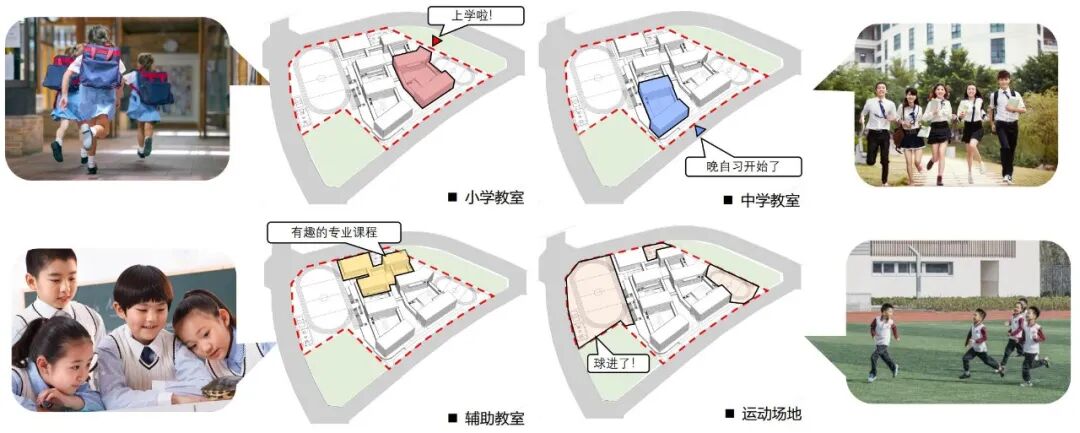 同时,也会将中小学高低年级分区,室外操场分列建筑两侧,以明确的中心景观绿轴来限定学生活动区域,使中小学日常学习互不干扰,规避不同年龄段学生冲撞的危险。