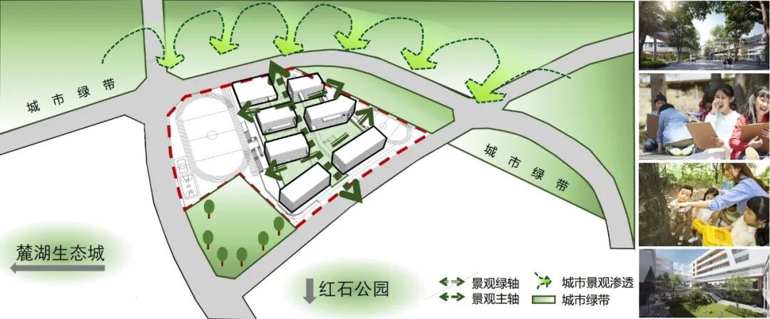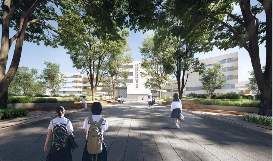 在拥有如此丰沃景观资源的条件下,学校将联动公园,设计出由南向北连接贯穿北侧绿带,同时又以林荫道与东侧绿化相接,将城市绿地全方位引入学校,使得学校点缀公园,公园为学校服务,内外强联动。