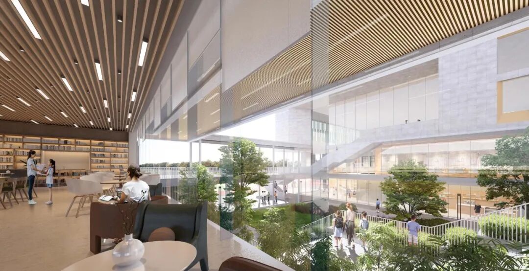 车辆即停即走,缓解学校上下学时间段的交通压力。放学时,学生可以沉浸在阅览室里与同学交流学习等待家长;地库也会设置等候区,家长可在此舒适地迎接放学的孩子。