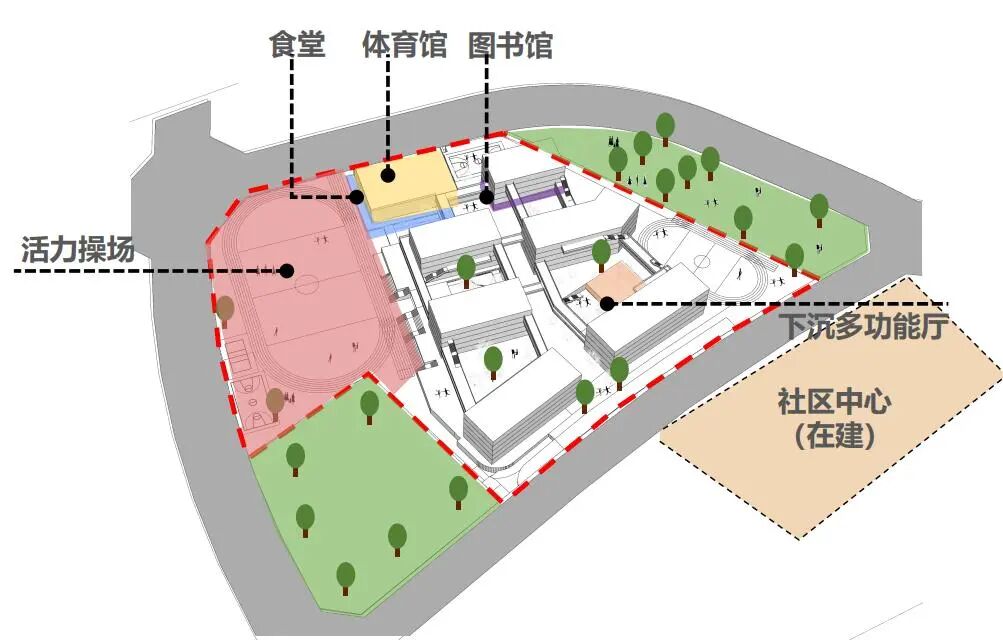 学校也会将体育馆、食堂、图书阅览室等功能空间相对独立出来与社区分时共享。