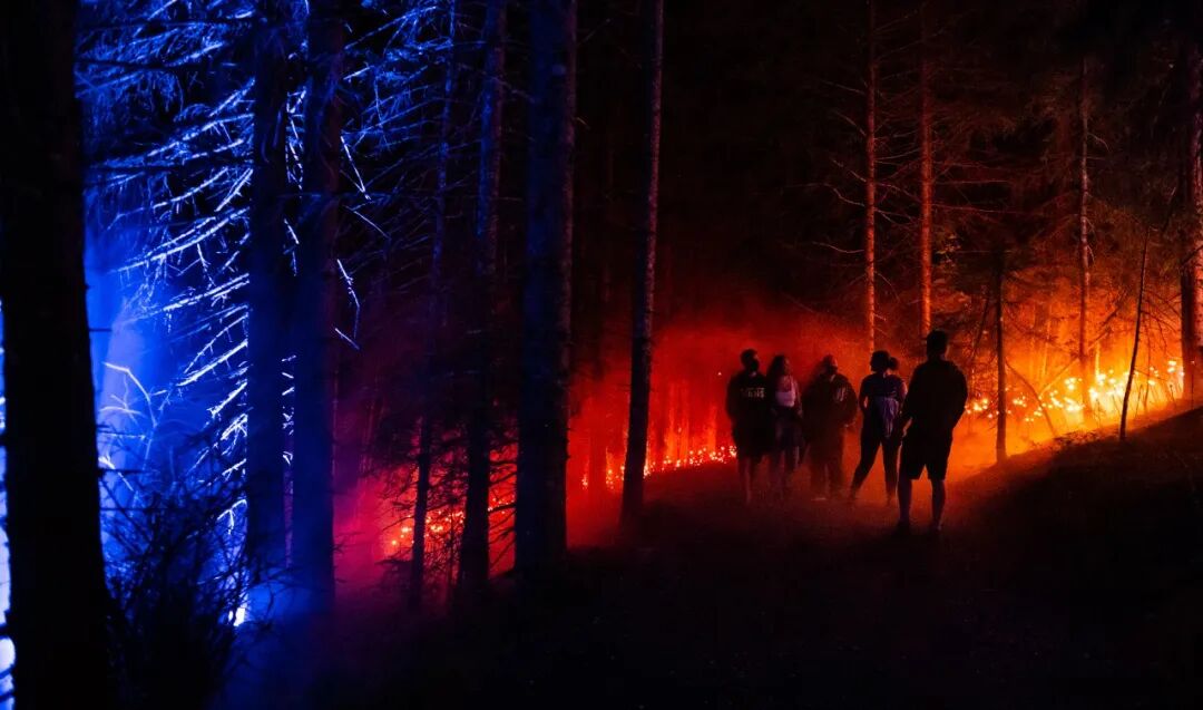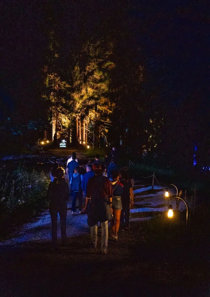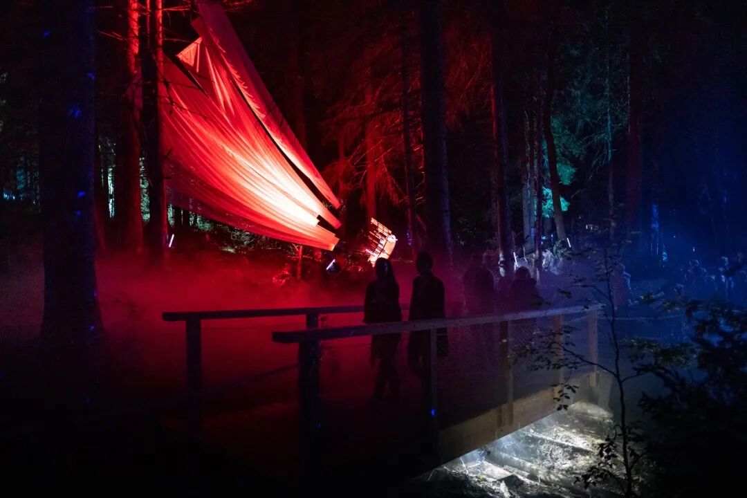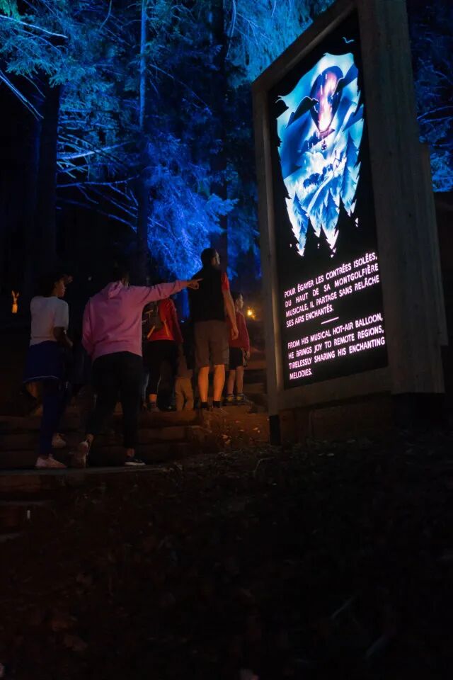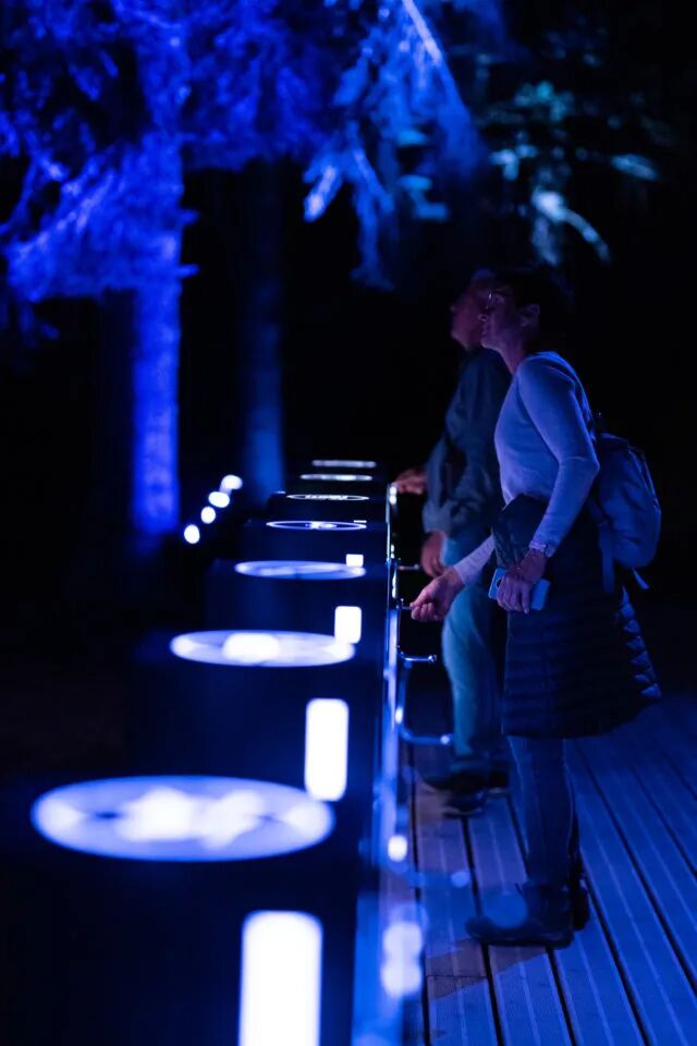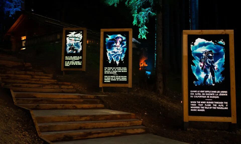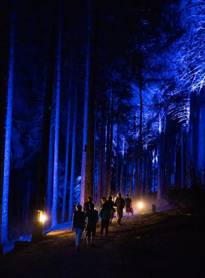 黄昏时分,柔和的蓝色和绿色灯光照亮了天空。在风景如画的Les Gets村,游客爬上一座平缓的山丘,经过一个小湖,会看到森林的轮廓,在光、音乐、图像、场景设计和交互性等多感官体验下开启夜游之旅。
