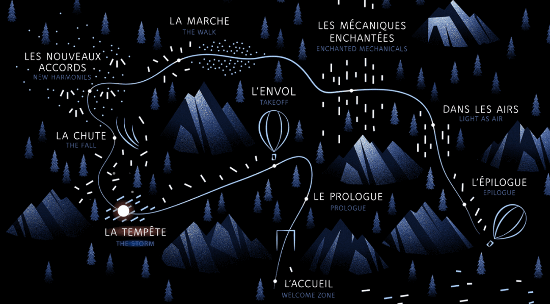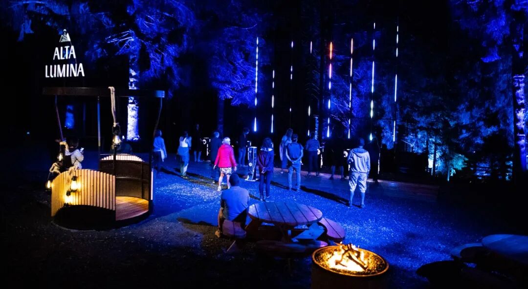 《Alta Lumina》是Moment Factory受邀为Les Gets打造的沉浸式夜游项目,也是Lumina系列第12个夜游项目。整个游览路线由10部分组成,包括欢迎区(Welcome zone)、序幕(Prologue)、起飞(Take off)、风暴(The storm)、跌落(The fall)、新和声(New harmonies)、步行(The walk)、魔法机械(Enchanted mechanicals)、轻如空气(Light as air)、结语(Epilogue)。