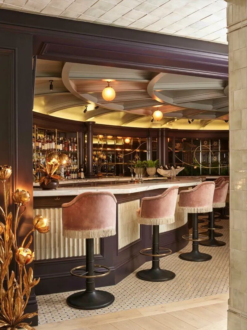中庭旁的酒吧区,格子的天花与镜面相呼应,创造出一种几何倾向的装饰主义效果。玫瑰金、金色、与深色木材,在历史氛围感的铺陈中,营造出奢贵质感。