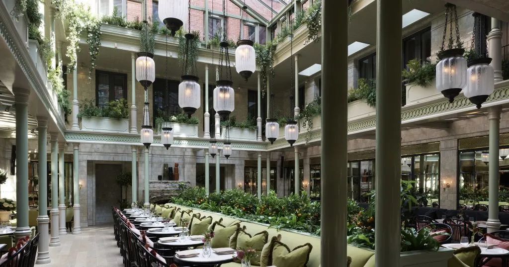 在郁郁葱葱的3层景观中庭内,拥有高耸的玻璃天花板,自然光线充足,白天充满活力,好像一个热带丛林的温室。垂下的如灯笼般的吊灯,则带来了东方的异域感,是装饰主义异国风格的特点之一。