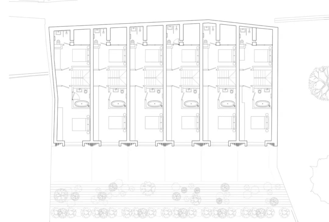 进门的这一面交错阶梯式的细节从邻近教堂建筑得到启发,每个住宅的入口都位于场地的后部,与沿街的旧农舍相一致。
