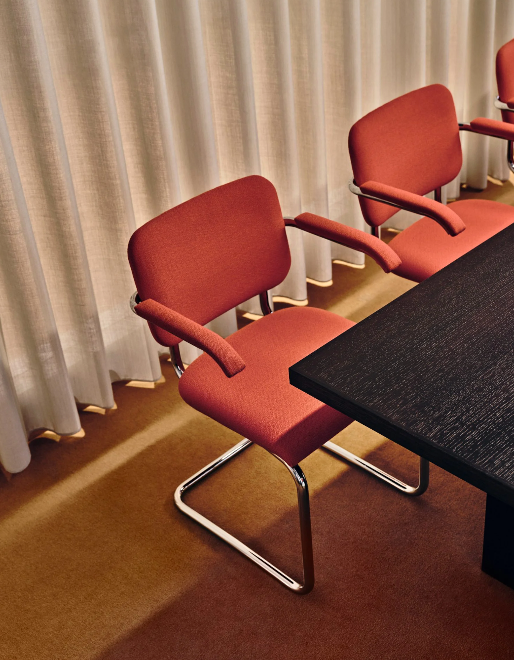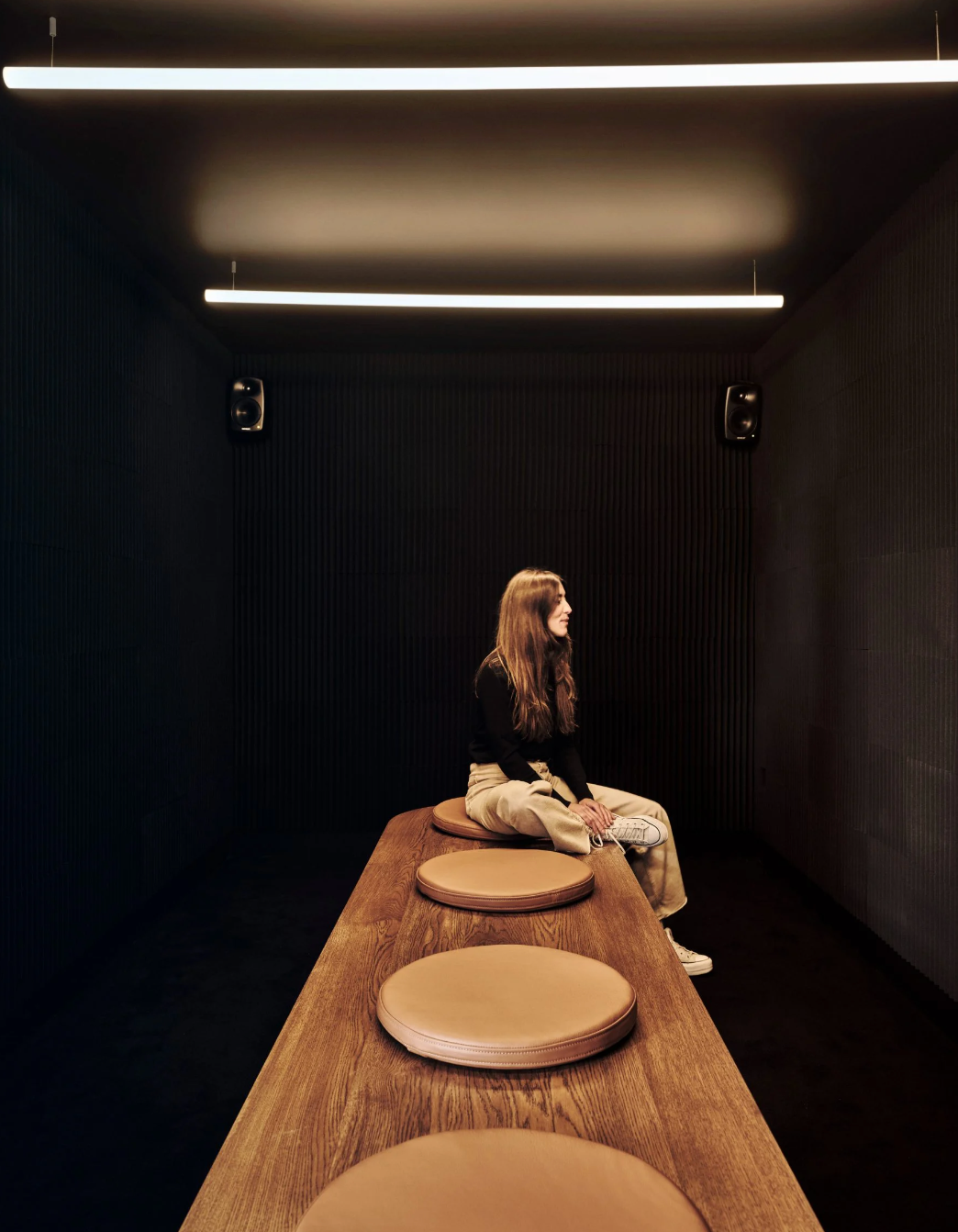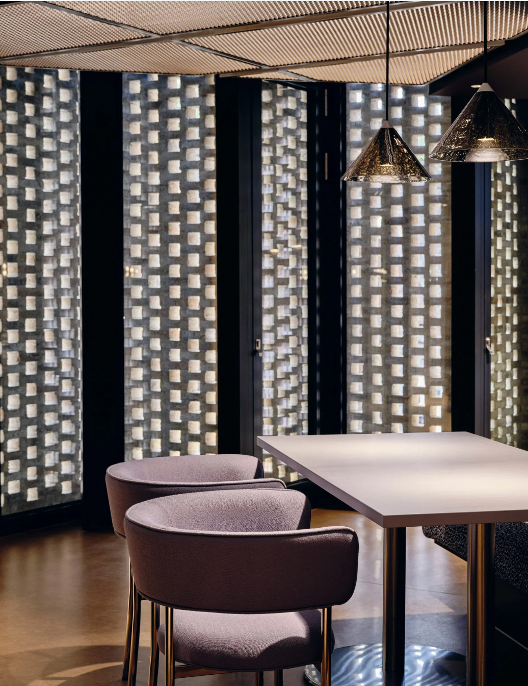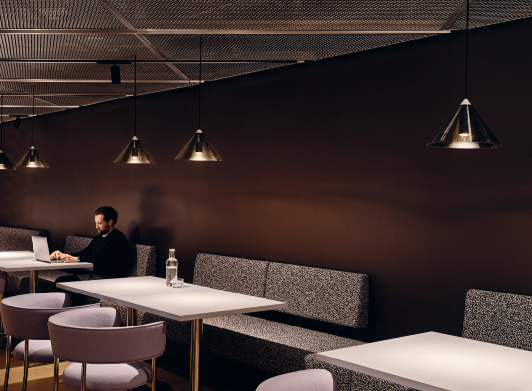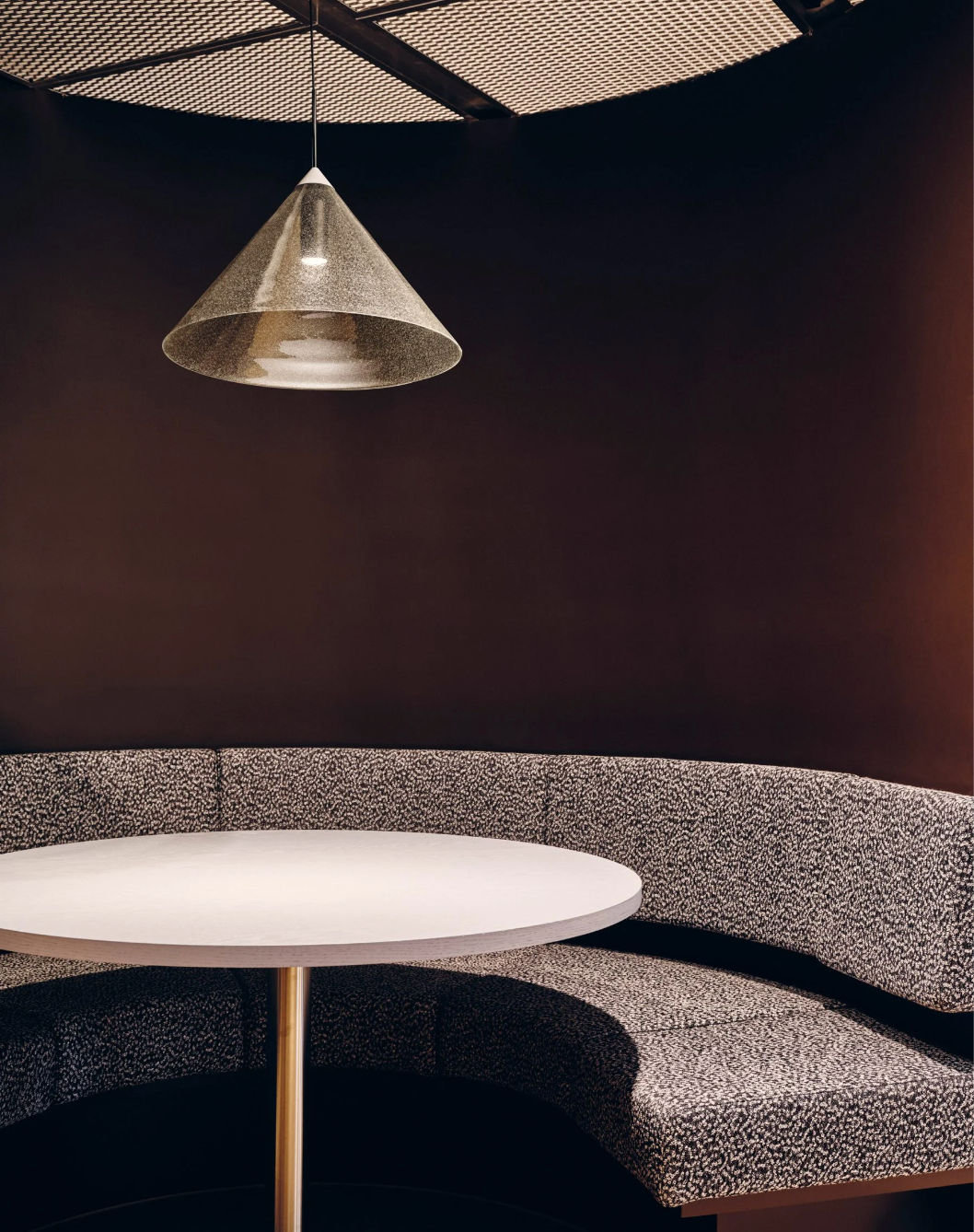 Thulstrup 为深色系空间设计了几款定制家具和照明设施,与高品质的丹麦纺织品品牌 Kvadrat 相结合。