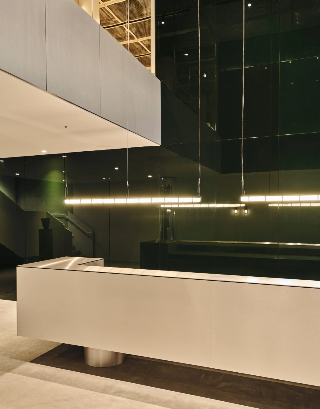 接待台后方的墙面选用绿色的高光亮面装饰板,成为大堂内颇为惹眼的空间亮点之一。