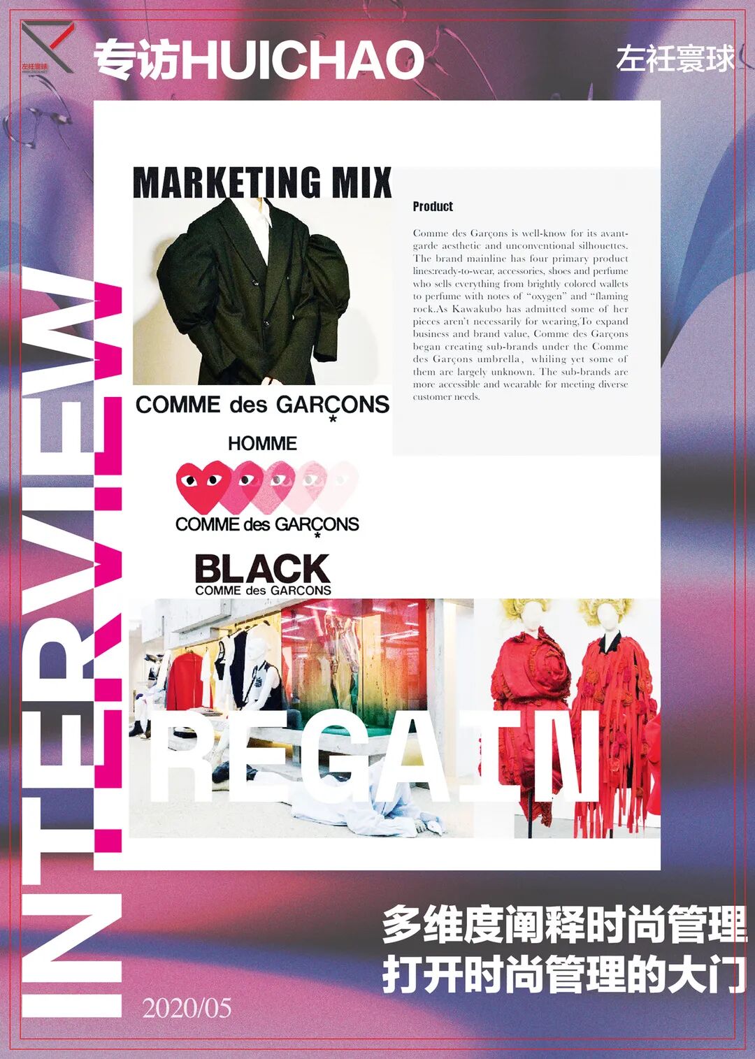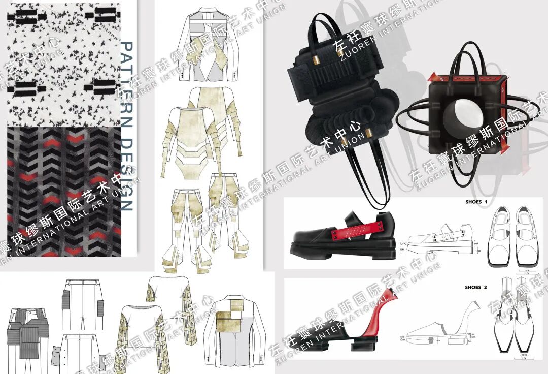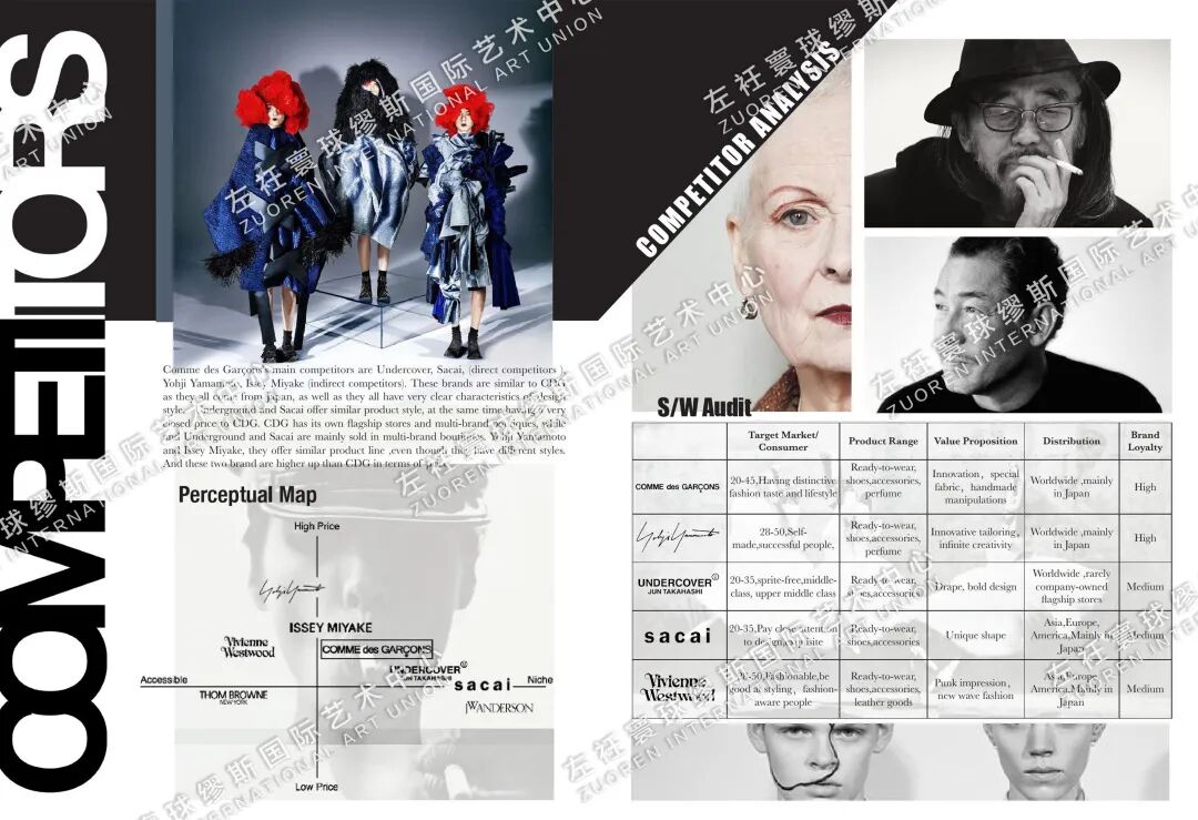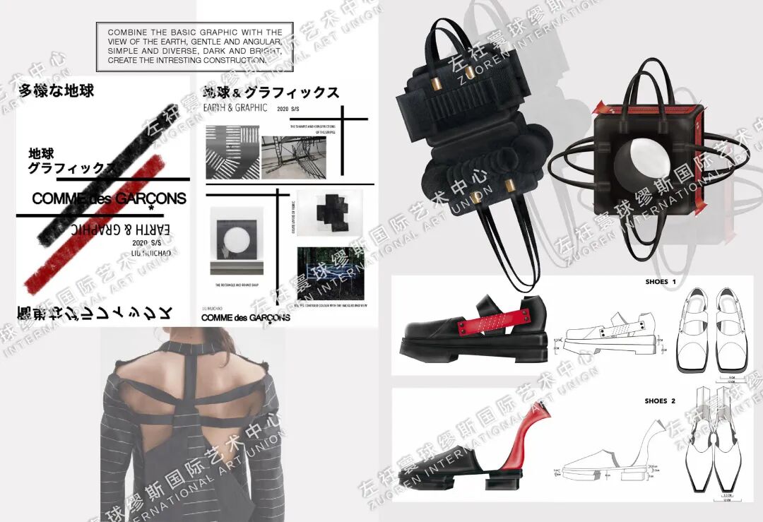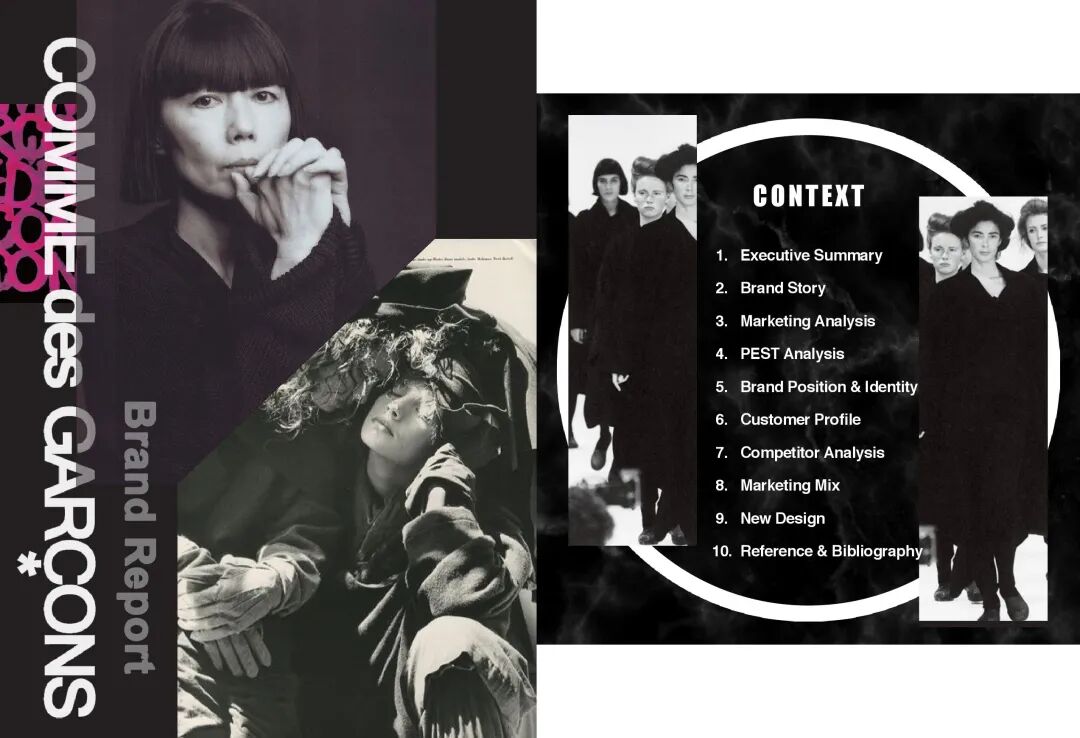 HUICHAO:我的作品集的第一个部分是我的做的关于COMME des GARCONS这个品牌的新一季度的企划案。这个企划案包括了市场分析,品牌定位,目标客户群分析,竞争对手分析,还有SWOT分析等等,然后紧接着是我的一个系列的设计,这个系列融合了我的个人设计灵感和川久保玲的设计风格,产品线也非常齐全,不仅有服装还有鞋帽、箱包等等。
