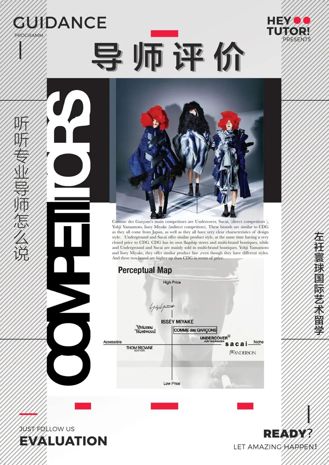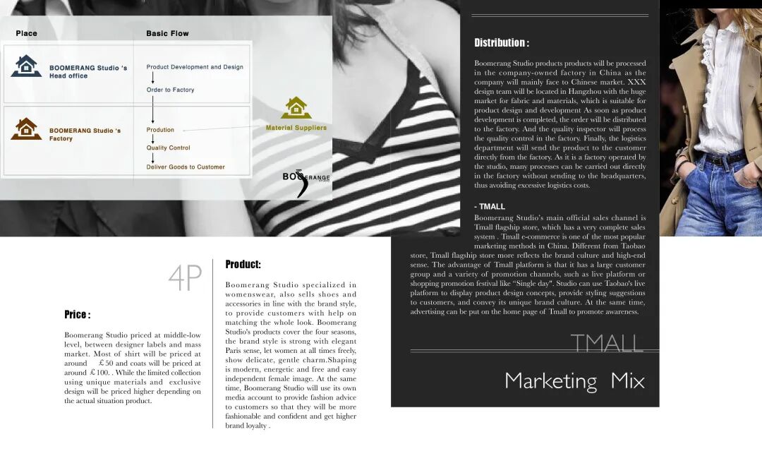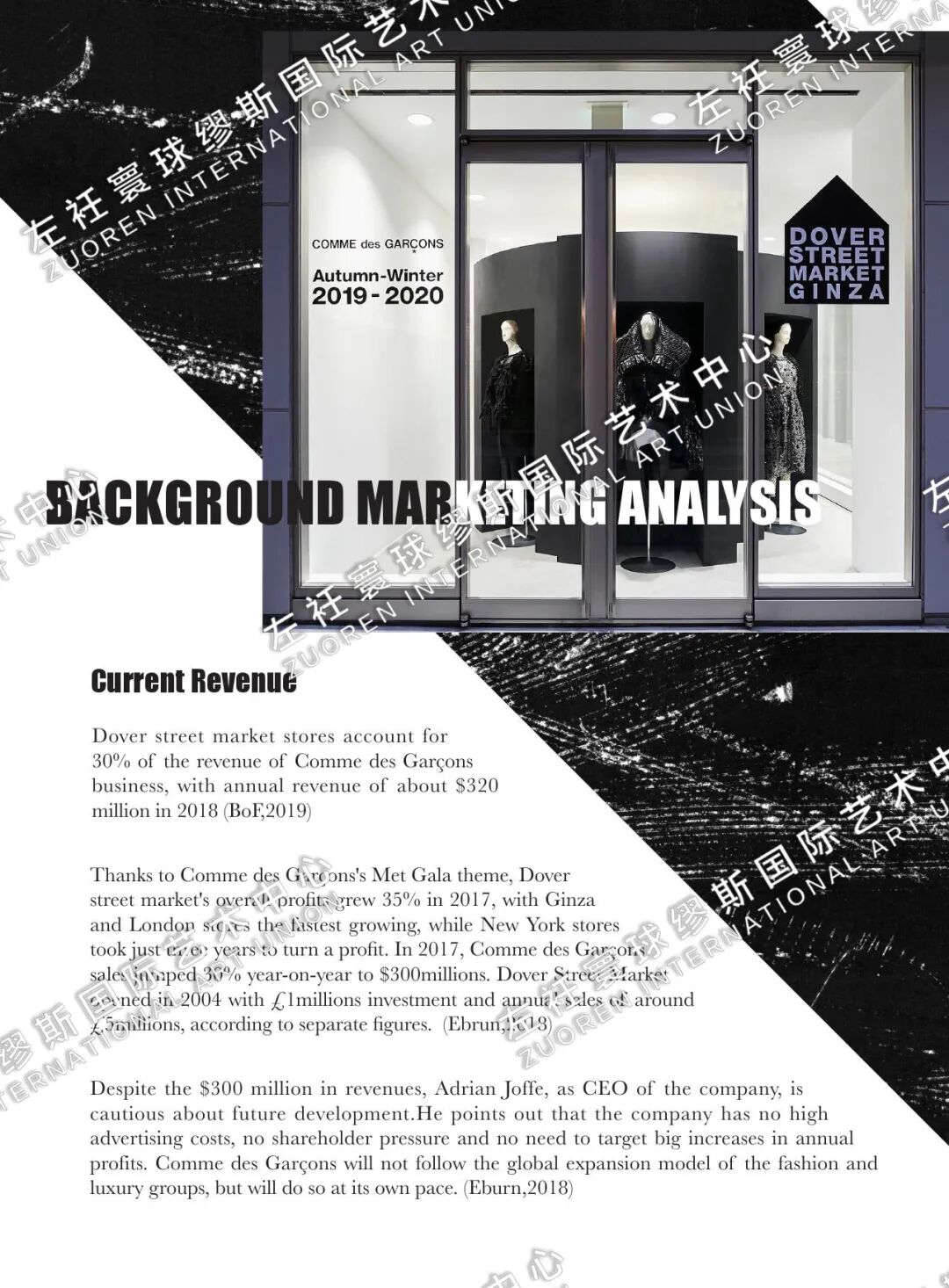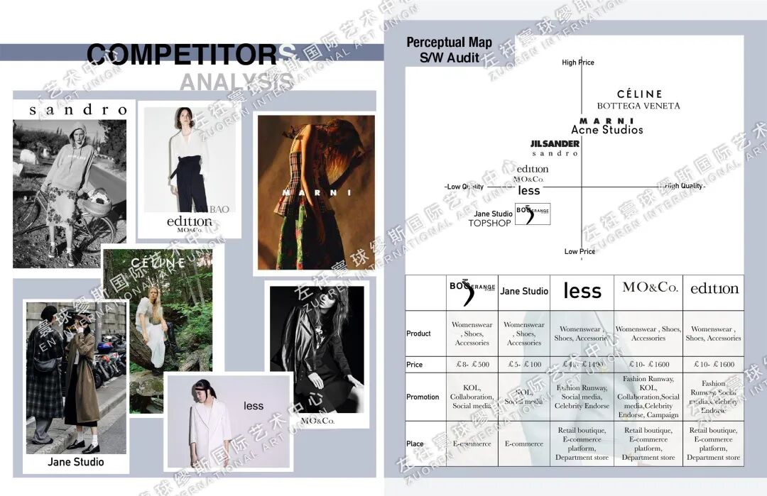 HUICHAO:我的作品集的第一个部分是我的做的关于COMME des GARCONS这个品牌的新一季度的企划案。这个企划案包括了市场分析,品牌定位,目标客户群分析,竞争对手分析,还有SWOT分析等等,然后紧接着是我的一个系列的设计,这个系列融合了我的个人设计灵感和川久保玲的设计风格,产品线也非常齐全,不仅有服装还有鞋帽、箱包等等。
