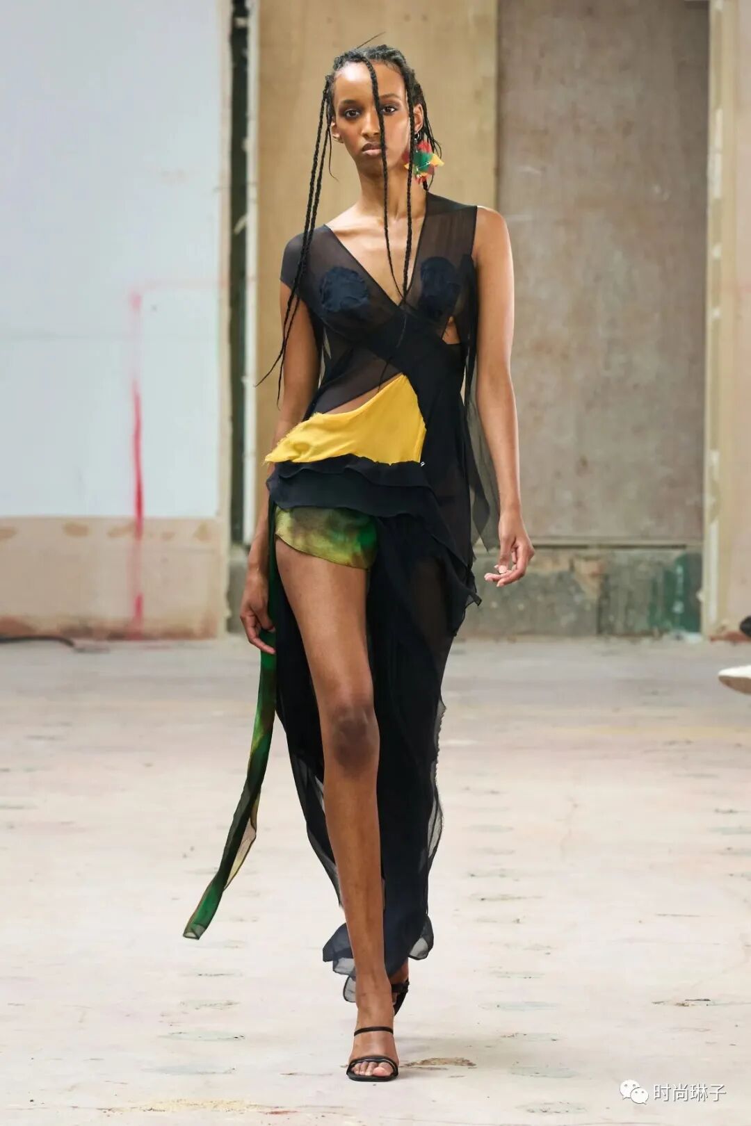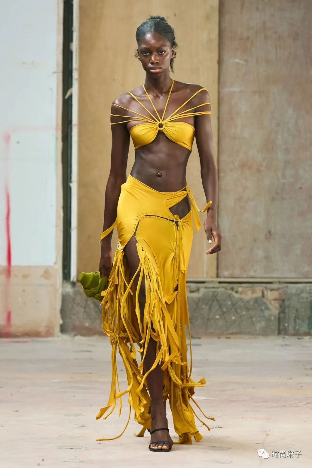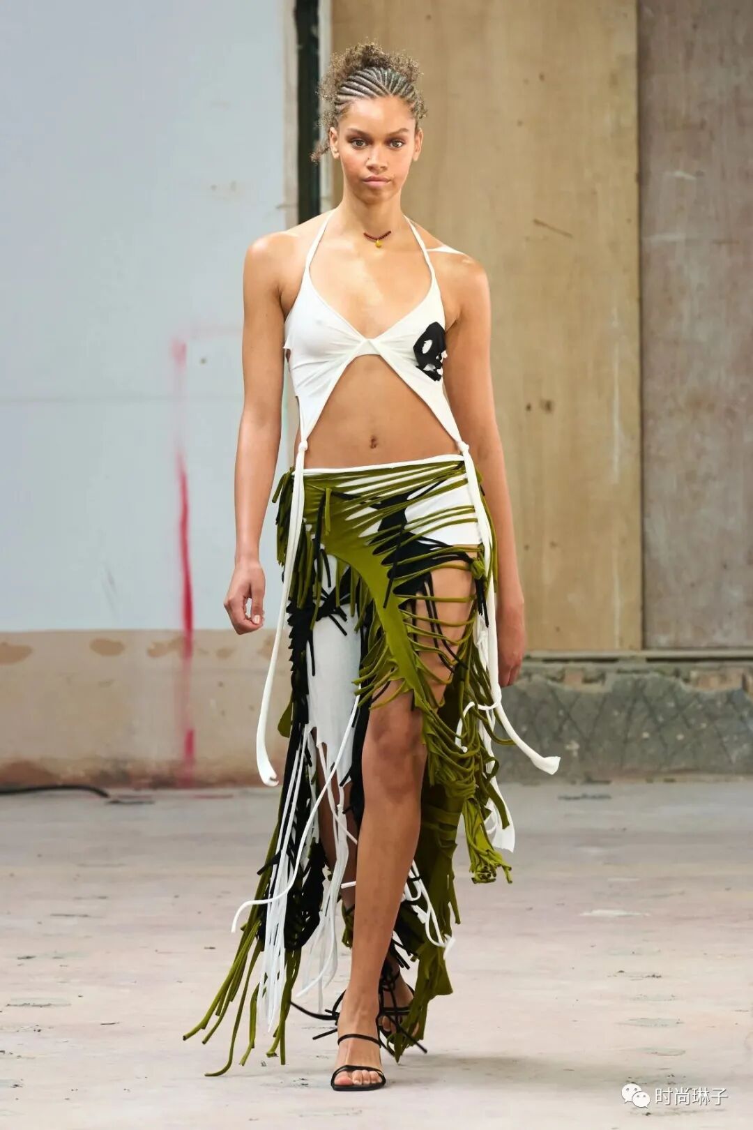 Jawara Alleyne 2023春夏系列是他在Fashion East东区时尚展示的最后一个系列。Jawara Alleyne通过别针拼接,以及面料撕裂,流苏装饰等细节设计和工艺,打造了海岛式的轻盈自由穿衣风格。