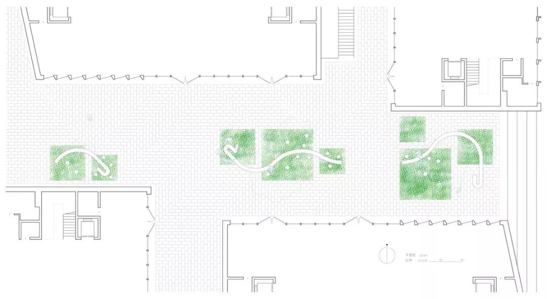 通过“长桌”处理植物与场地、与建筑之间的联系,同时它又是为人服务的,满足一般桌子的所有功能。个体的人在这里找到自己的一个位置,而多个“个体行为+独立位置”连结起来,成为整体。建筑和自然被对等地对待。