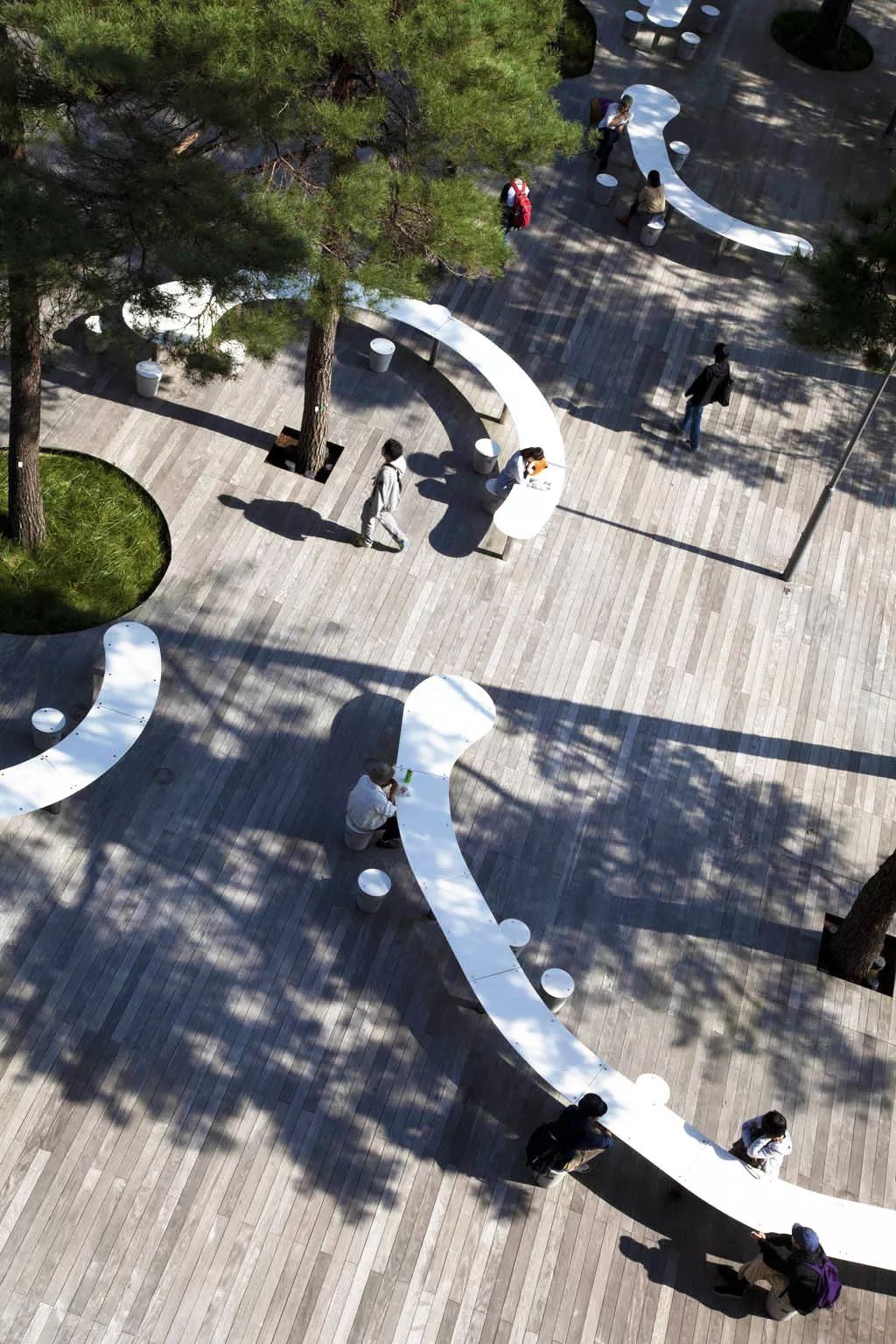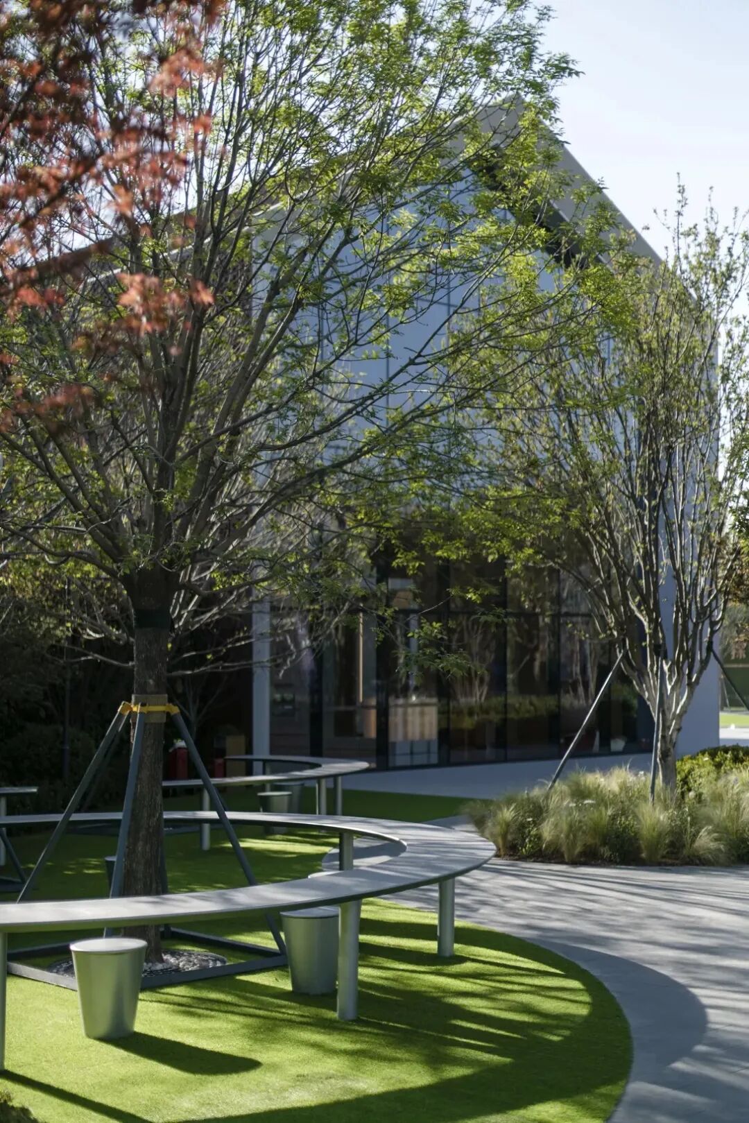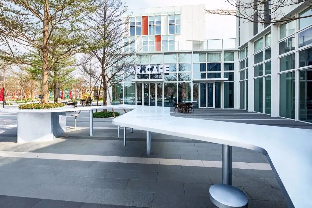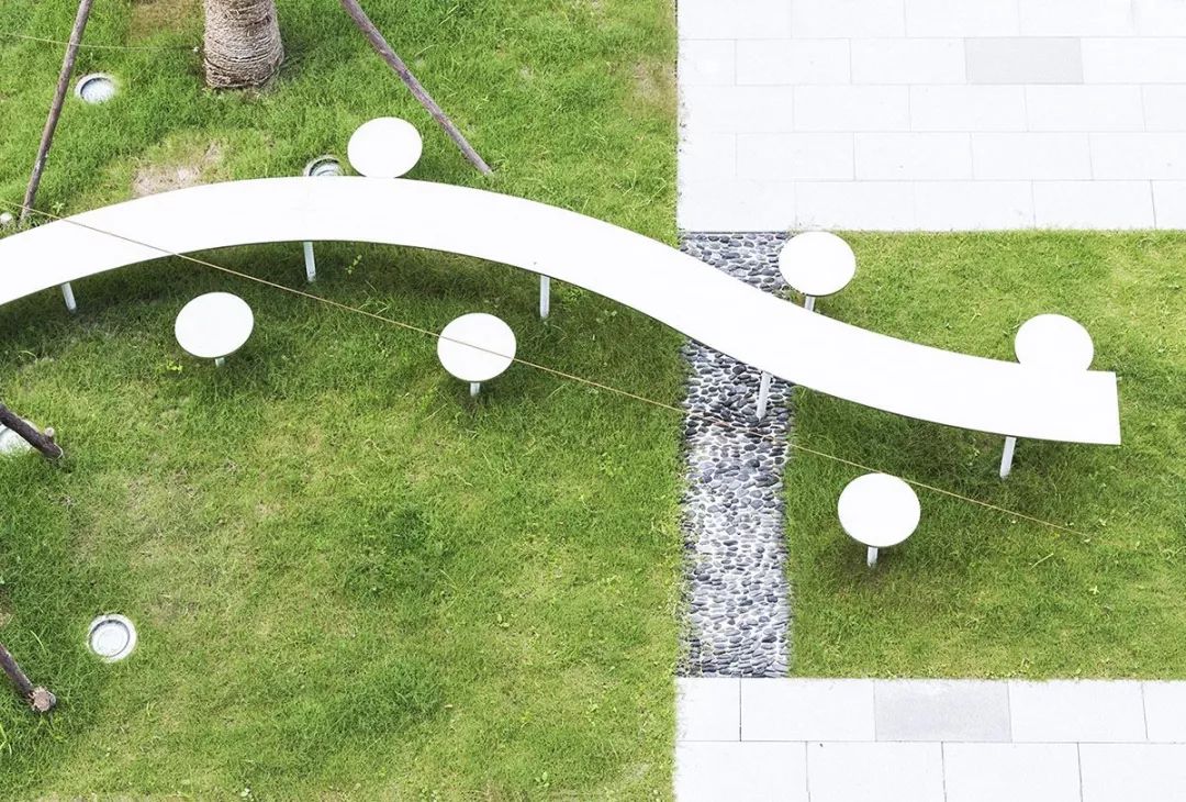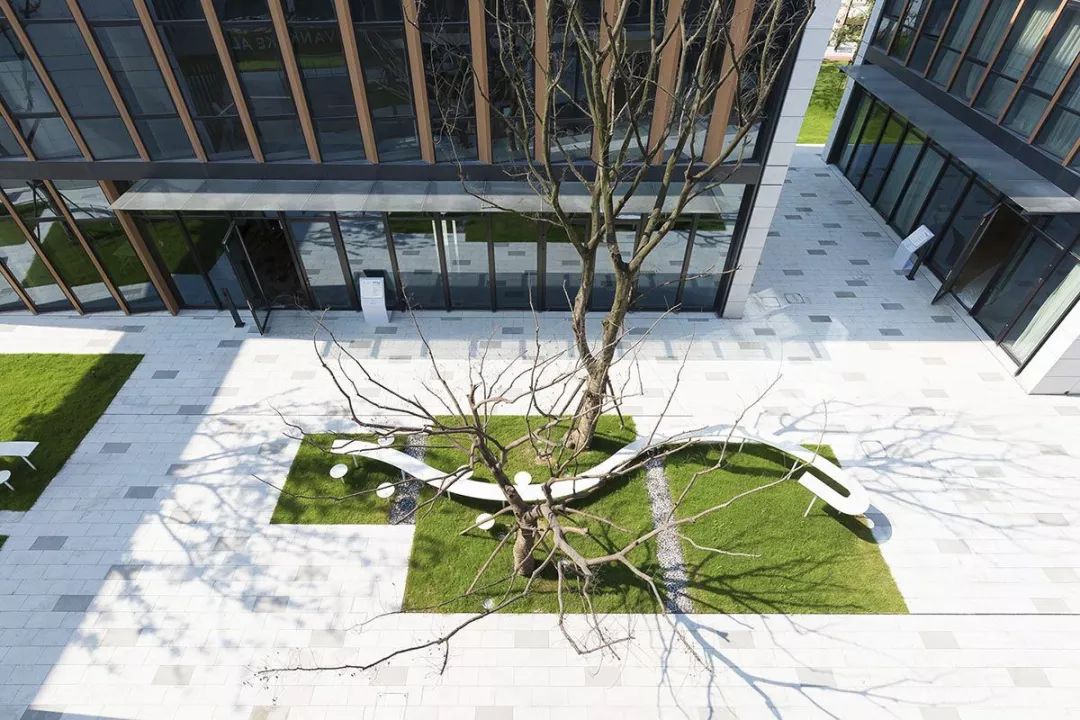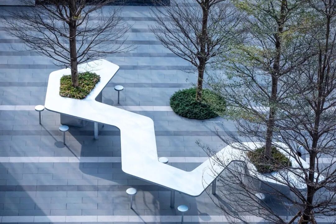 设计师考虑了大片矩阵林地空间,主要目的是弱化市政道路带来的生硬感,同时创造了具有很多可能性的林下空间;最后也恰到好处的的呼应了建筑的“宇宙魔方”理念。线形的铺装、条形的座凳这些设计语言强化了办公区的引导性。