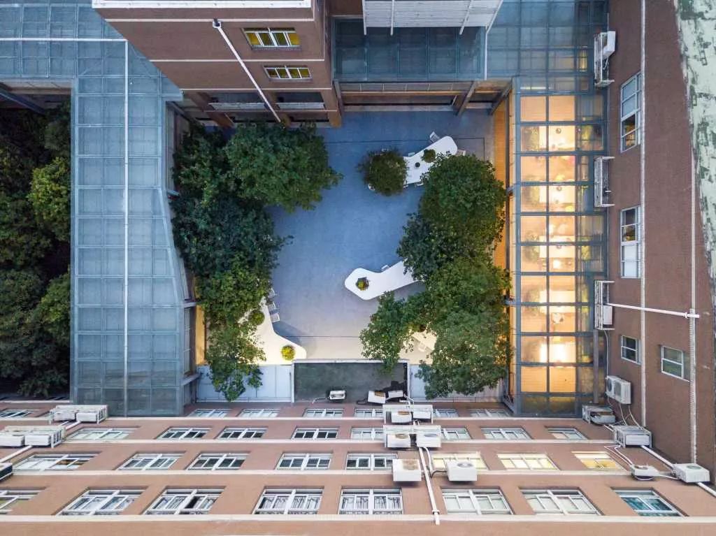 花园中保留了原有的11棵大树并设置了维护