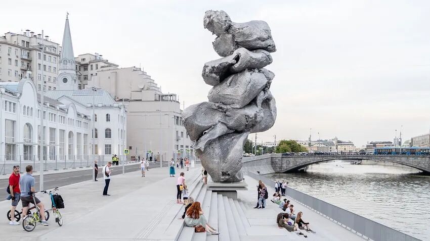 在河边的河岸上矗立着 Urs Fischers Big Clay No. 4。
