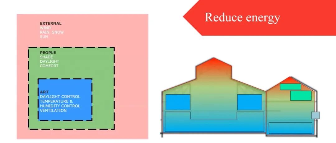 整个艺术空间结构可以大致分为三个层次,由外至内分别是:室外层(风、雨、雪、日照)、人群层(光、影、舒适)、艺术层(可控制光照、温度、通风),用于存放不同需求的艺术作品,做到“艺术无处不在”。