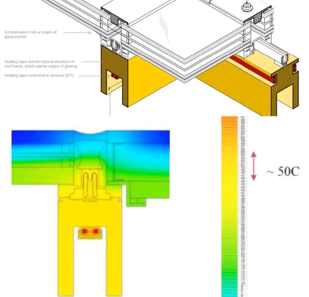 因此在屋顶结构中,装有收集太阳能的装置。用于加热,蒸发室内多余水汽。冬季也可通过适当加热,融化屋顶上的积雪。