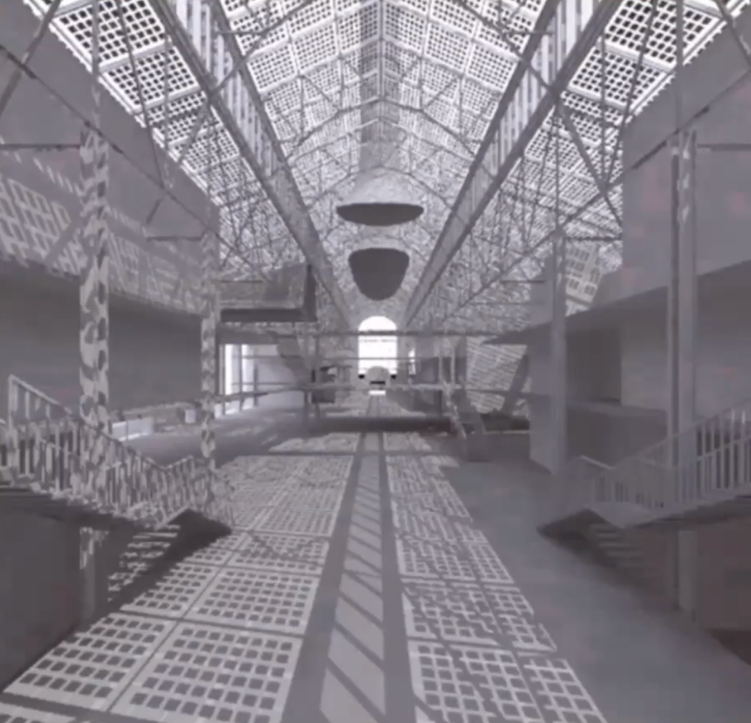 第二个想法是创建一个流动和可见网络。作为一种空间雕塑。这个”网"由所有楼梯、电梯、走廊、檐篷和平台组成。