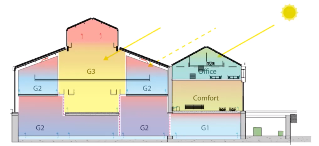 伦佐工作室将原先的建筑中庭高度抬高,形成热岛效应,促进空气流通。