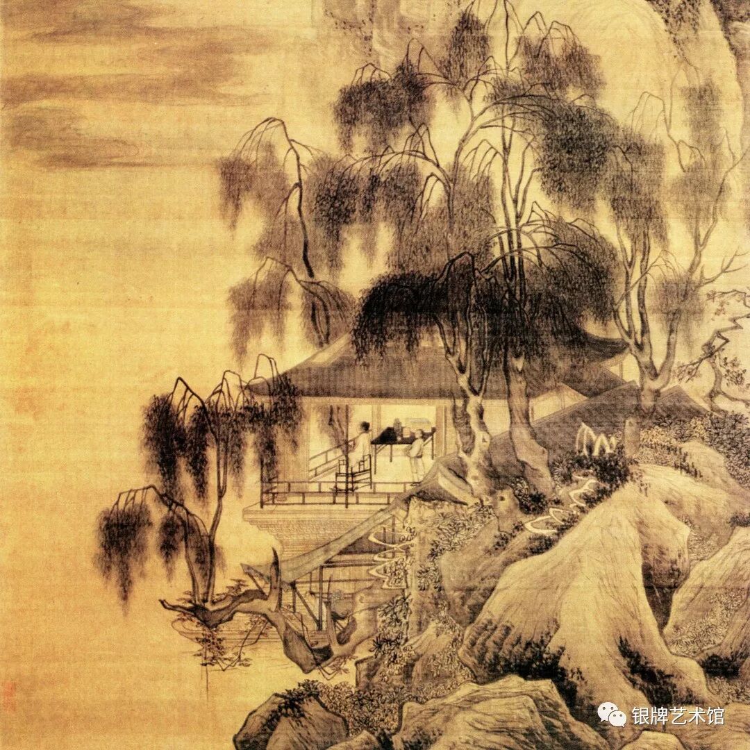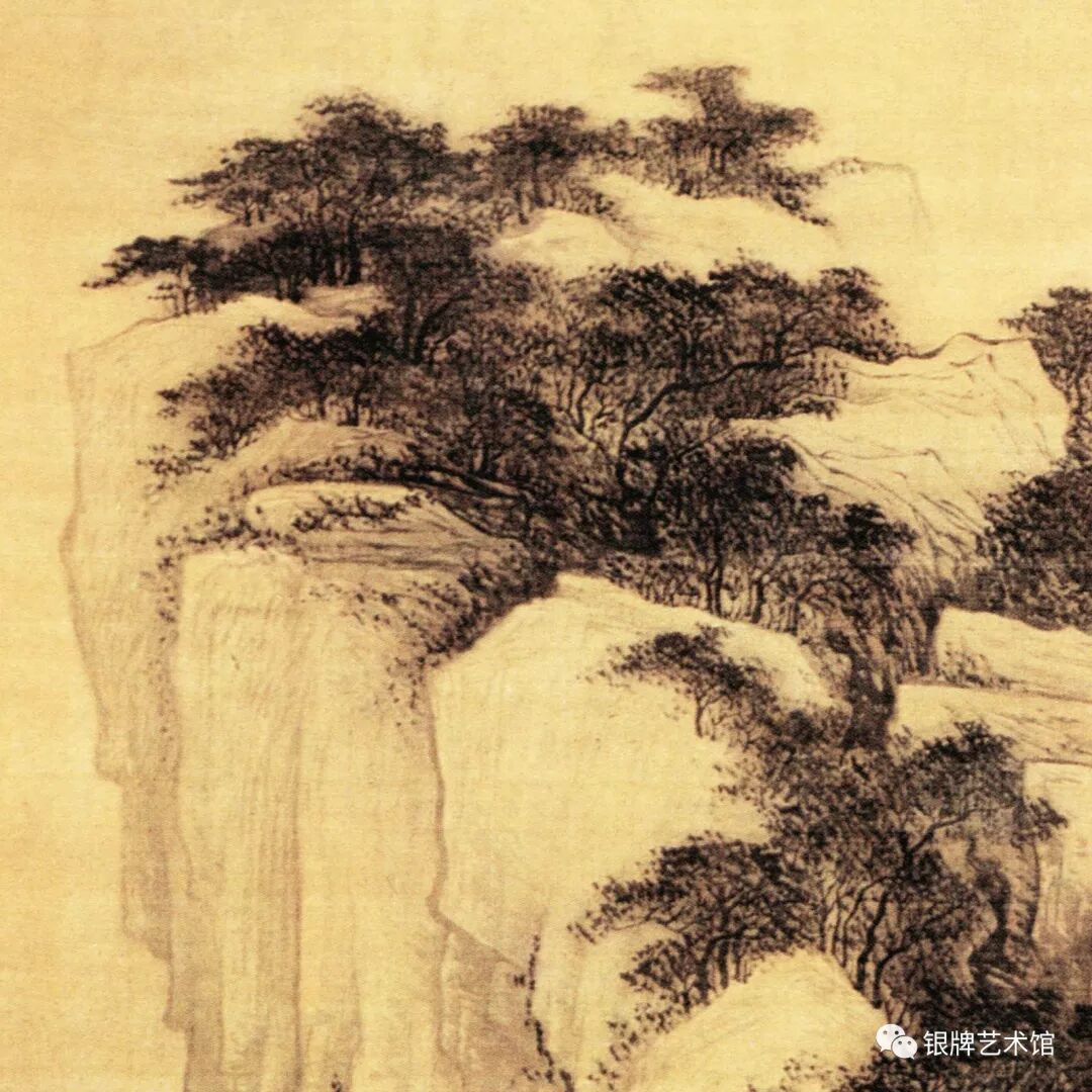 在表现技法上,近景的山石多用湿笔皴擦,勾斫相间,用墨较重。