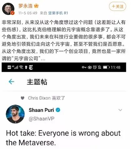 11月5日清晨,罗永浩发微博表示,下一个创业项目是一家“元宇宙公司”!并配有Shaan Puri在社交媒体发文的长图。据公开资料显示,Shaan Puri曾在2017-2019年担任现已不存在的社交网络平台Bebo的首席执行官。文中写道:非常深刻,从来没从这个角度想过这个问题(这差距让人有些伤感),这比扎克伯格理解的元宇宙概念靠谱多了。 从这个角度出发,我们未来在科技行业要做的很多事,都会不可避免地引领我们走向这个元宇宙,甚至不管我们是否愿意。从这个角度出发,我们的下一个创业项目,竟然也是一家所谓的“元宇宙公司”… 10月30日,罗永浩回复微博博主@吴阳时表示:我不相信元宇宙会成为未来(游戏只是游戏)……不过这不重要,我对未来的判断经常都是错的。(每日经济新闻)