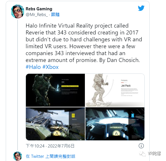 此外,@Rebs Gaming还表示,整个游戏概念起源于推特用户@Nibre,他现在是34Industries公司的工程师,正在开发《光环:士官长合集》系列,他发布了他们正在开发的一个功能齐全的《光环》VR游戏的片段。
