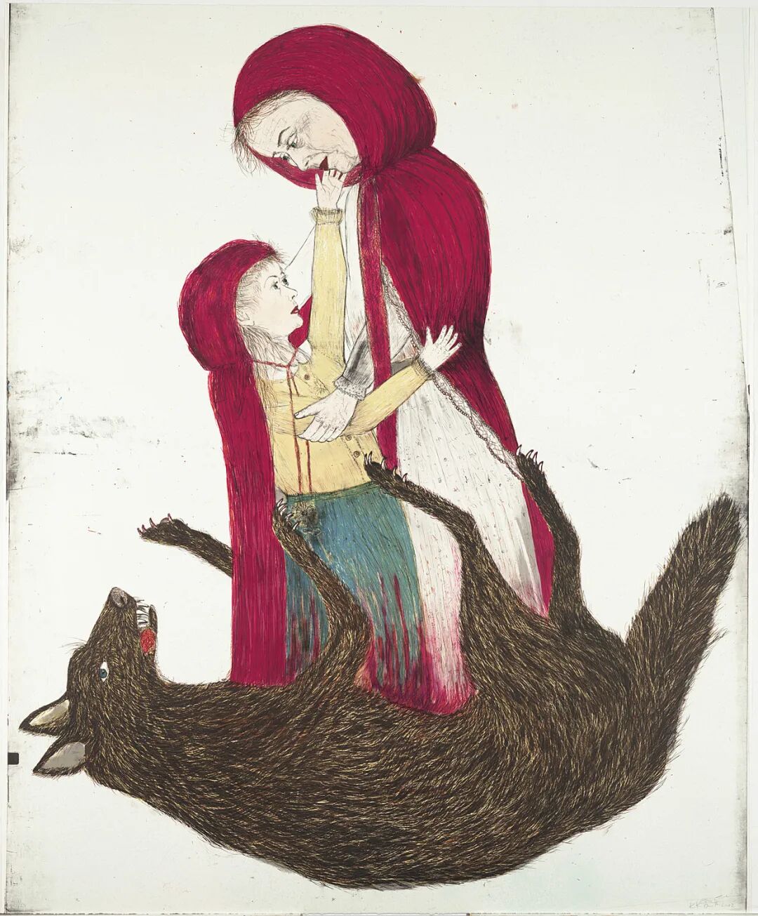 “小红帽”是另一位美国艺术家奇奇·史密斯 (Kiki Smith) 长期创作的母题,她所反转的不是迪士尼、而是童话故事本身。在“Born”(出生,2002)细腻绵密的手工画面中,大灰狼不再是诱捕者,而是母亲,戴着红斗篷的小女孩和老婆婆从狼身中诞生,神似早期西方宗教画,透着神圣的牺牲、降生与哺育意味。奇奇·史密斯身为女性对生育的身体经验以及自然的关注折射其中。