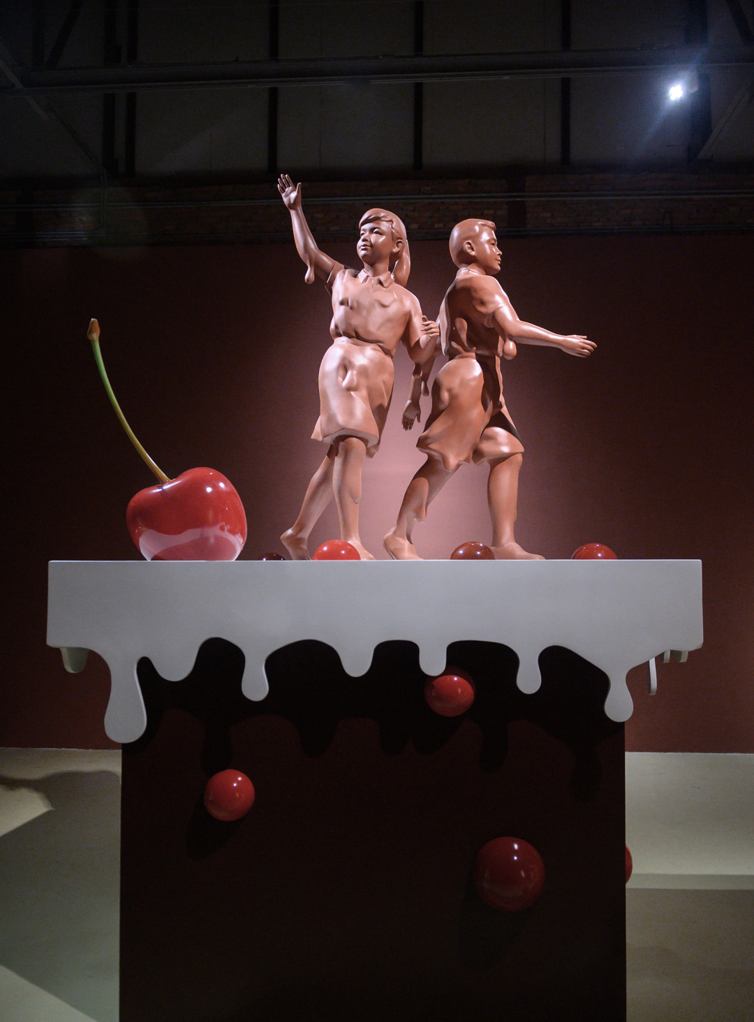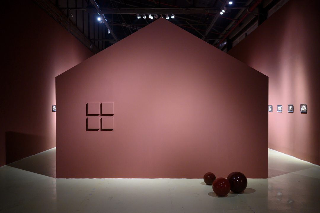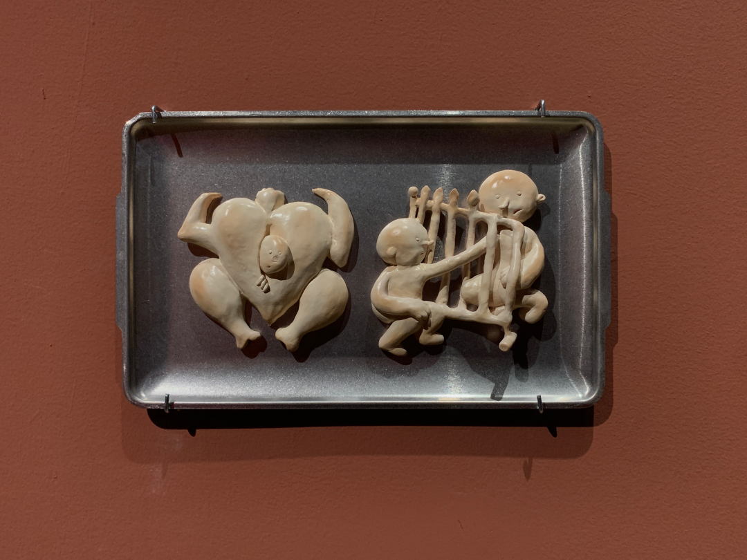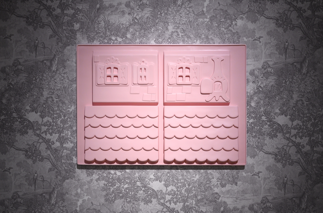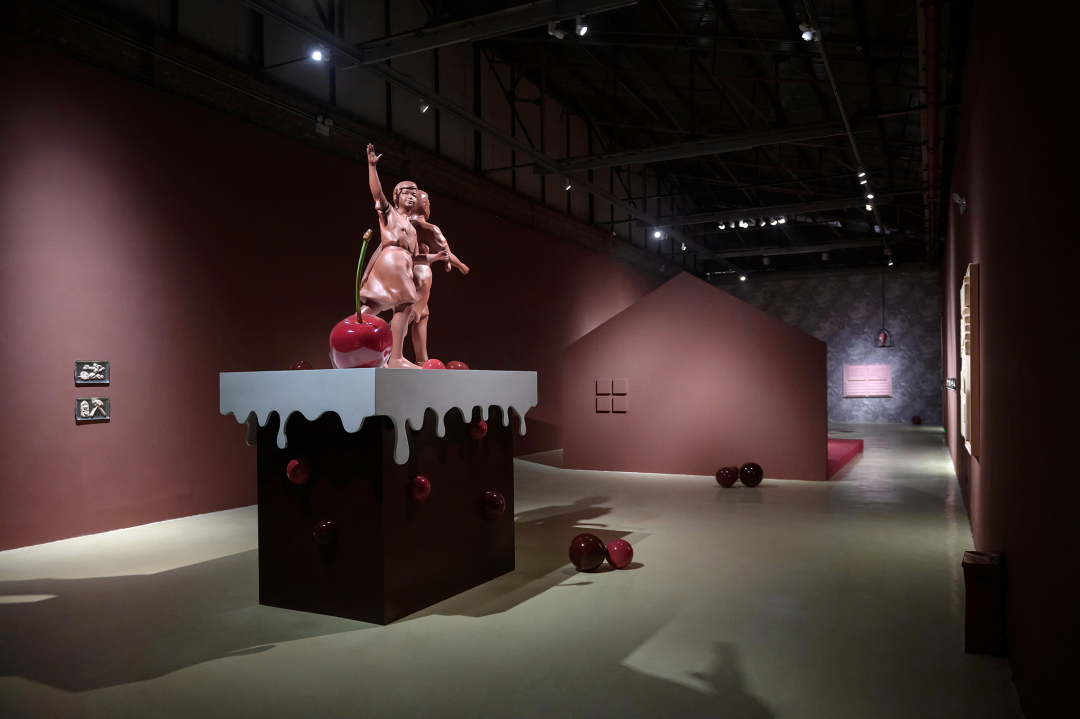 现场的雕塑、装置以及墙纸、地毯包括墙面粉刷都是制作优良的。这种“优良感”散布在:光滑闪亮的类似山楂糖果的质感;均匀的、带有一定浓厚度的介于砂岩红和巧克力之间的墙面颜色;同画反复的18-19世纪欧洲童话书中描绘森林野趣的黑白插画的墙纸图案;现实主义人像雕塑与可爱又诡异的卡通造型并置;不锈钢餐盘里烘烤得像饼干、形式又似浮雕的软陶泥塑……之上。尤其是涂了色的墙面,让空间本身强烈的Loft气质和“白盒子”属性换成了一种散发着私密气息并隐隐召唤“红色”叙事的“界面”空间,它介于观者身处的实体空间与“现实”环境,以及《汉瑟尔与格莱特》这部童话自它问世以来所堆叠起的口说、印刷和影音时空之间。正是这种对整体空间的氛围营造,让参观的体验摆脱了典型的当代艺术展览中观看单件作品的方式,这也恰恰对应了前文提到的“展览式”创作,现场不仅有作品,还包含了艺术家对展厅空间的改造。