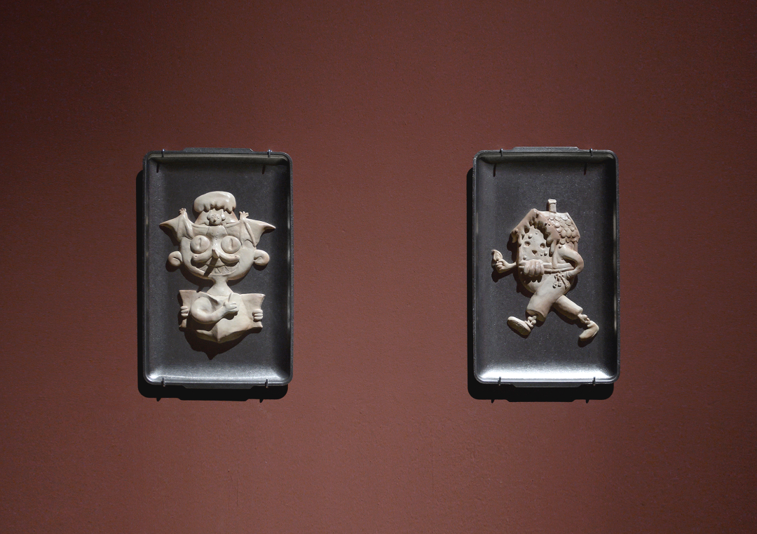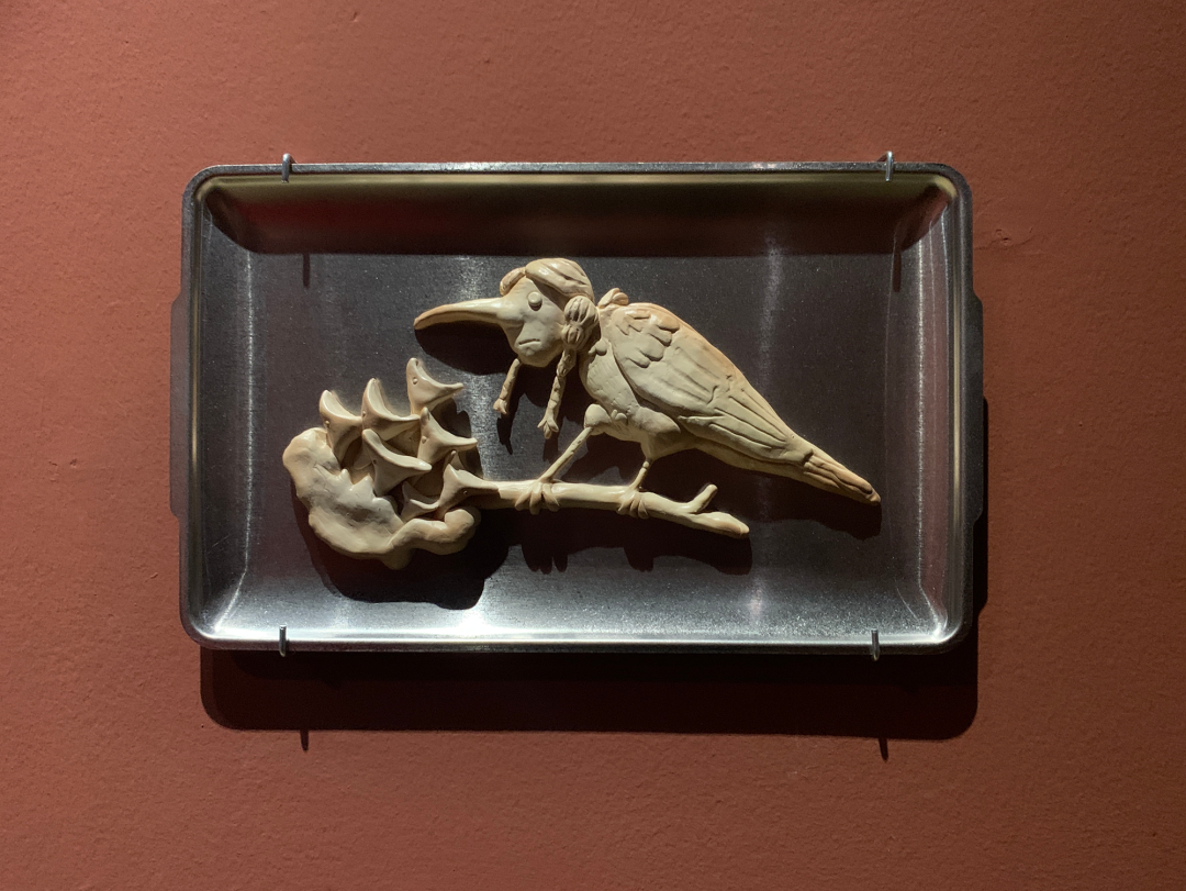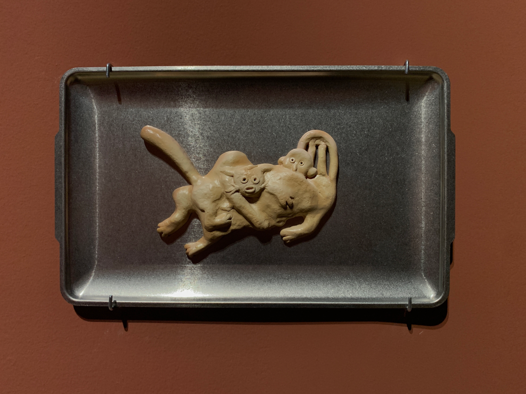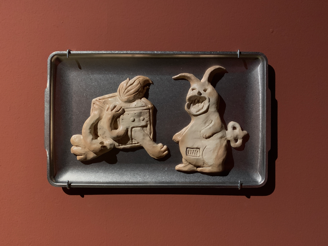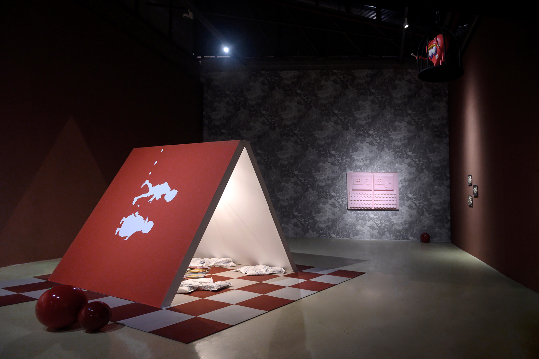 现场的雕塑、装置以及墙纸、地毯包括墙面粉刷都是制作优良的。这种“优良感”散布在:光滑闪亮的类似山楂糖果的质感;均匀的、带有一定浓厚度的介于砂岩红和巧克力之间的墙面颜色;同画反复的18-19世纪欧洲童话书中描绘森林野趣的黑白插画的墙纸图案;现实主义人像雕塑与可爱又诡异的卡通造型并置;不锈钢餐盘里烘烤得像饼干、形式又似浮雕的软陶泥塑……之上。尤其是涂了色的墙面,让空间本身强烈的Loft气质和“白盒子”属性换成了一种散发着私密气息并隐隐召唤“红色”叙事的“界面”空间,它介于观者身处的实体空间与“现实”环境,以及《汉瑟尔与格莱特》这部童话自它问世以来所堆叠起的口说、印刷和影音时空之间。正是这种对整体空间的氛围营造,让参观的体验摆脱了典型的当代艺术展览中观看单件作品的方式,这也恰恰对应了前文提到的“展览式”创作,现场不仅有作品,还包含了艺术家对展厅空间的改造。
