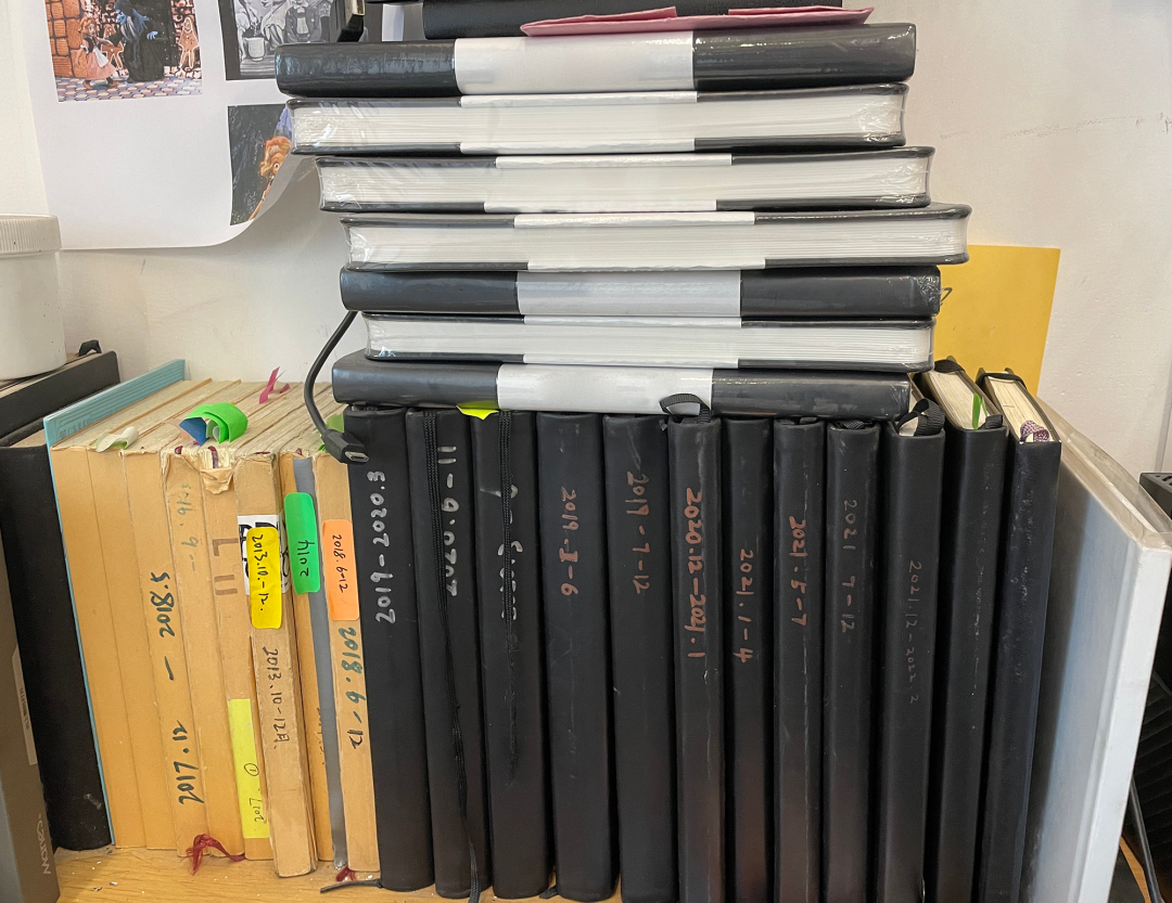 陆平原工作台上的手稿笔记本,从2007年迄今已积累了七八十本