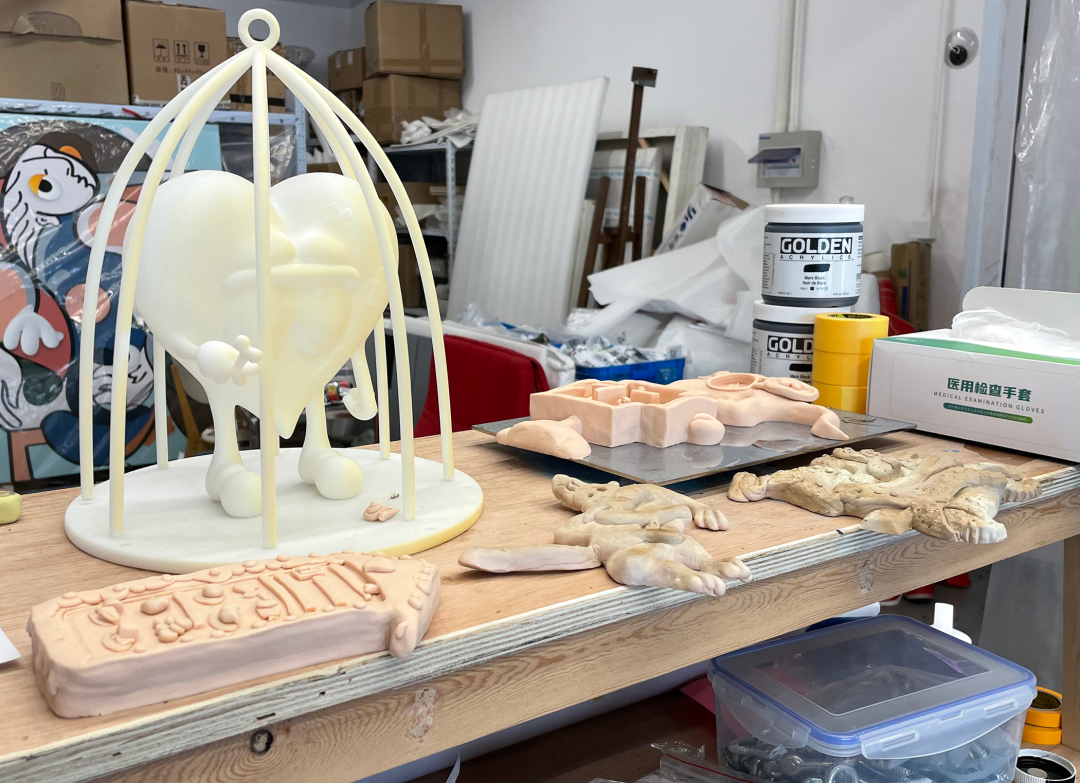 陆平原兼用手工与工厂制作的方式,然而手工作物仍保有一种鲜亮的塑料感,工业制品在体量上并不奇观宏大,展品的材质没有被强调、反而被隐藏起来。软陶、玻璃钢或树脂,这些可塑性极强的材料在表面处理过后呈现出接近现成品的观感。在展览筹备的半年期间,陆平原从手绘图稿到输出3D文件,从亲手捏塑、反复试验烘焙参数到与工人沟通制作细节、通过微信远程调试打样效果,多线程同步完成。与八九十年代老一代只能接触到有限的艺术史与外界信息、在重复中探索艺术语言的中国艺术家相比,发达的互联网通讯、相对平价成熟的工厂和不断提速升级的软件都让制作过程变得越来越便捷,当代采用这种制作方式的艺术家能够在相对快速的节奏中践行选择、控制的操作;但技术或许也意味着可能性的有限。牵制还会来自市场化,艺术家也需平衡兼顾自己在既有系列和新创作之间的投入。 在中国的当代艺术创作中尤其如此,人们需要以变应变,不懈探寻合时宜的语言(有时只是话术)和形式,艺术成了一种既主动亦被动的领域。这可能是今天做艺术创作的困境,也是陆平原直言有种“缺乏坐标系”的感觉。由于“展览式”创作的越发普遍,艺术家们的每次亮相被期待都是“新成品”,这让试错的空间变得狭窄。在开展前,他们要反复自问:这已经是最好的方式了吗?还有别的方式吗?还有别的材料吗?