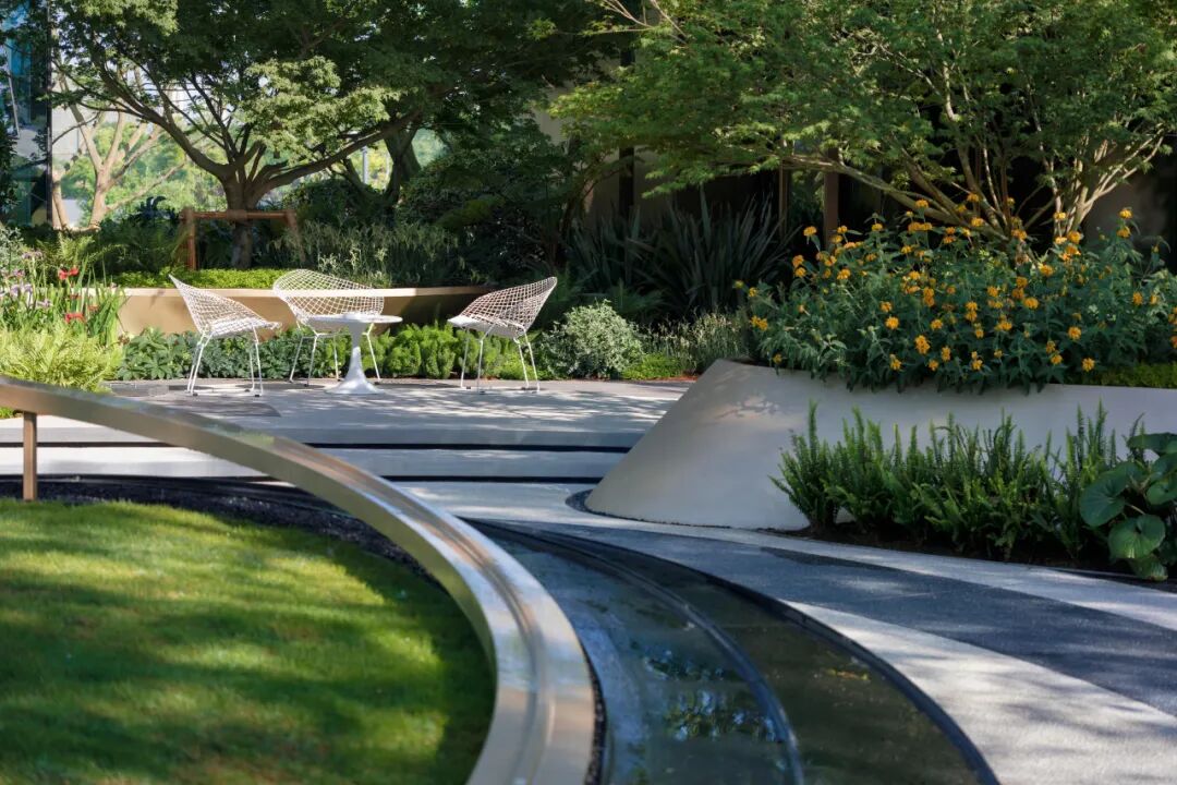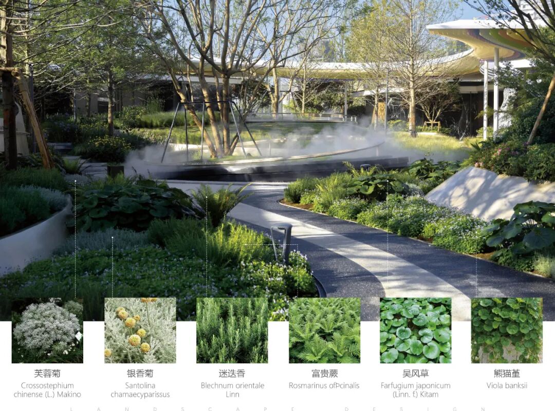 斑驳的光影,圆形的树池与环形铺装、金属“光环”相得益彰,形成视觉上的焦点,设计突出自然流线元素,为人们提供更加自然舒适感的绿色空间系统。