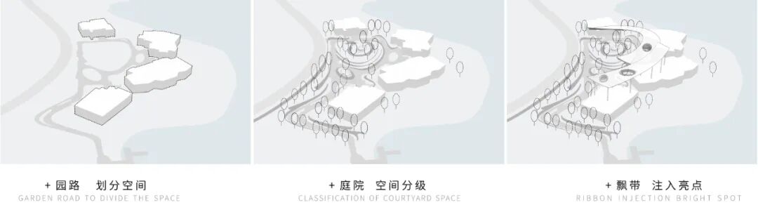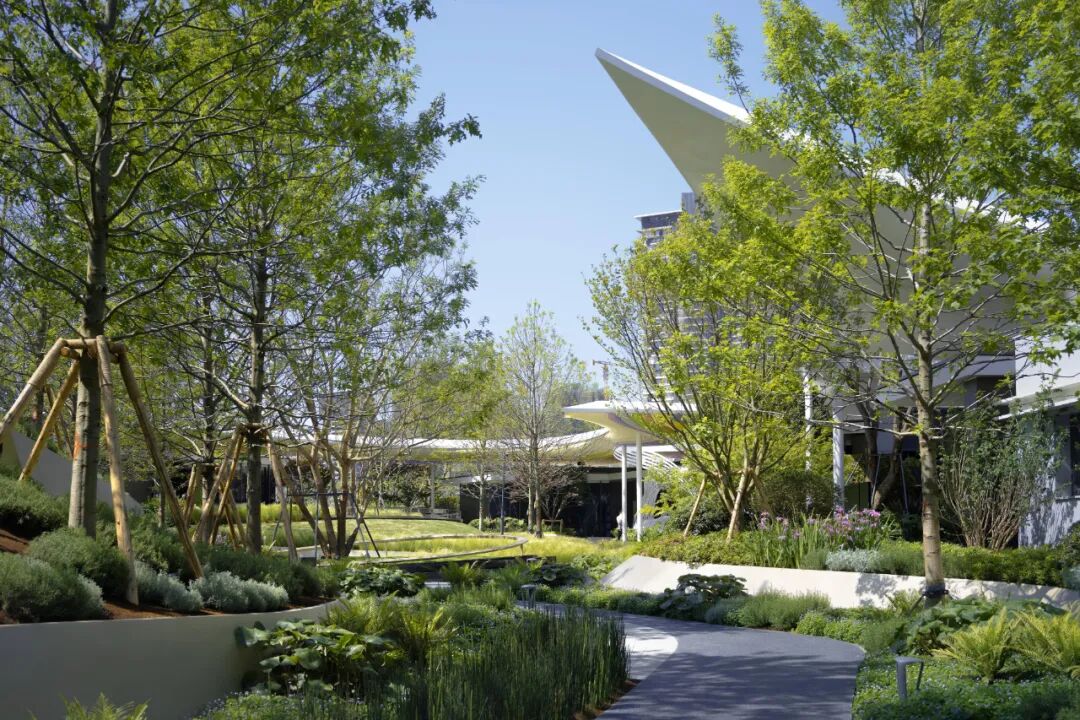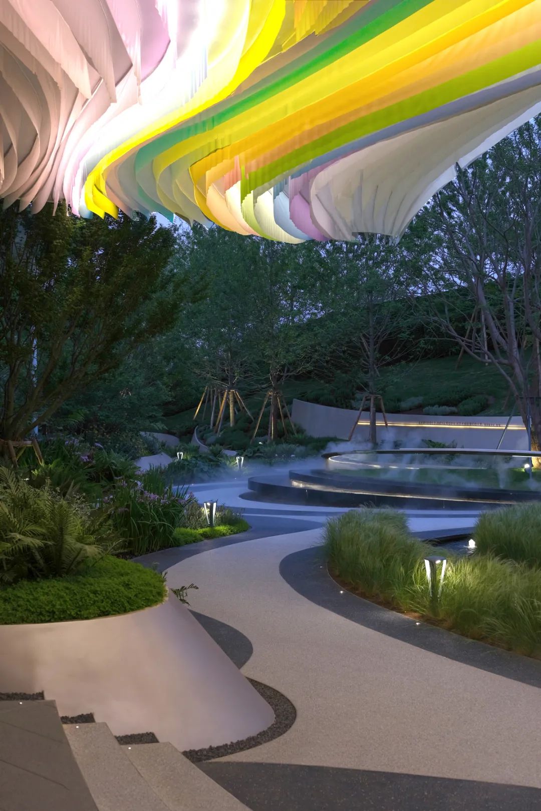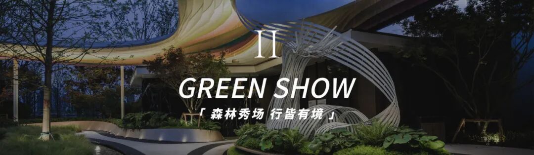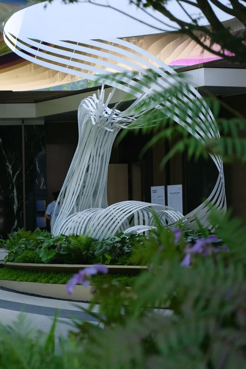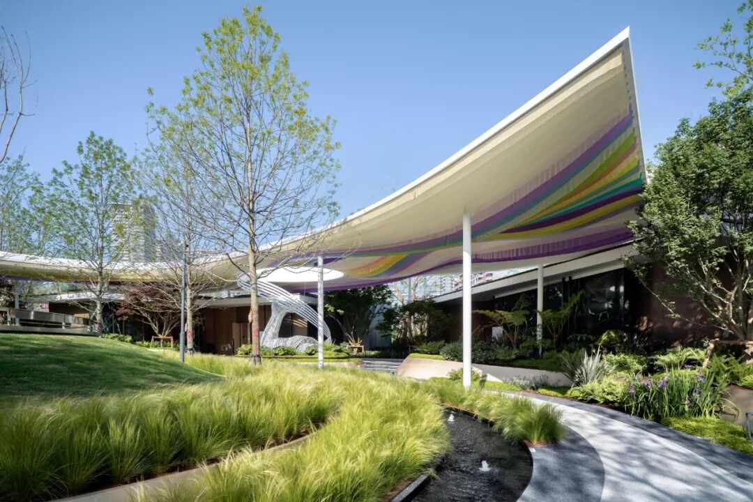 廊架上的流光飘带凝结艺术个性的曲线,以森林秀场的形式场地核心记忆空间,柔性铺陈诗意,丰盈咫尺生活尺度,以指向未来的态度;