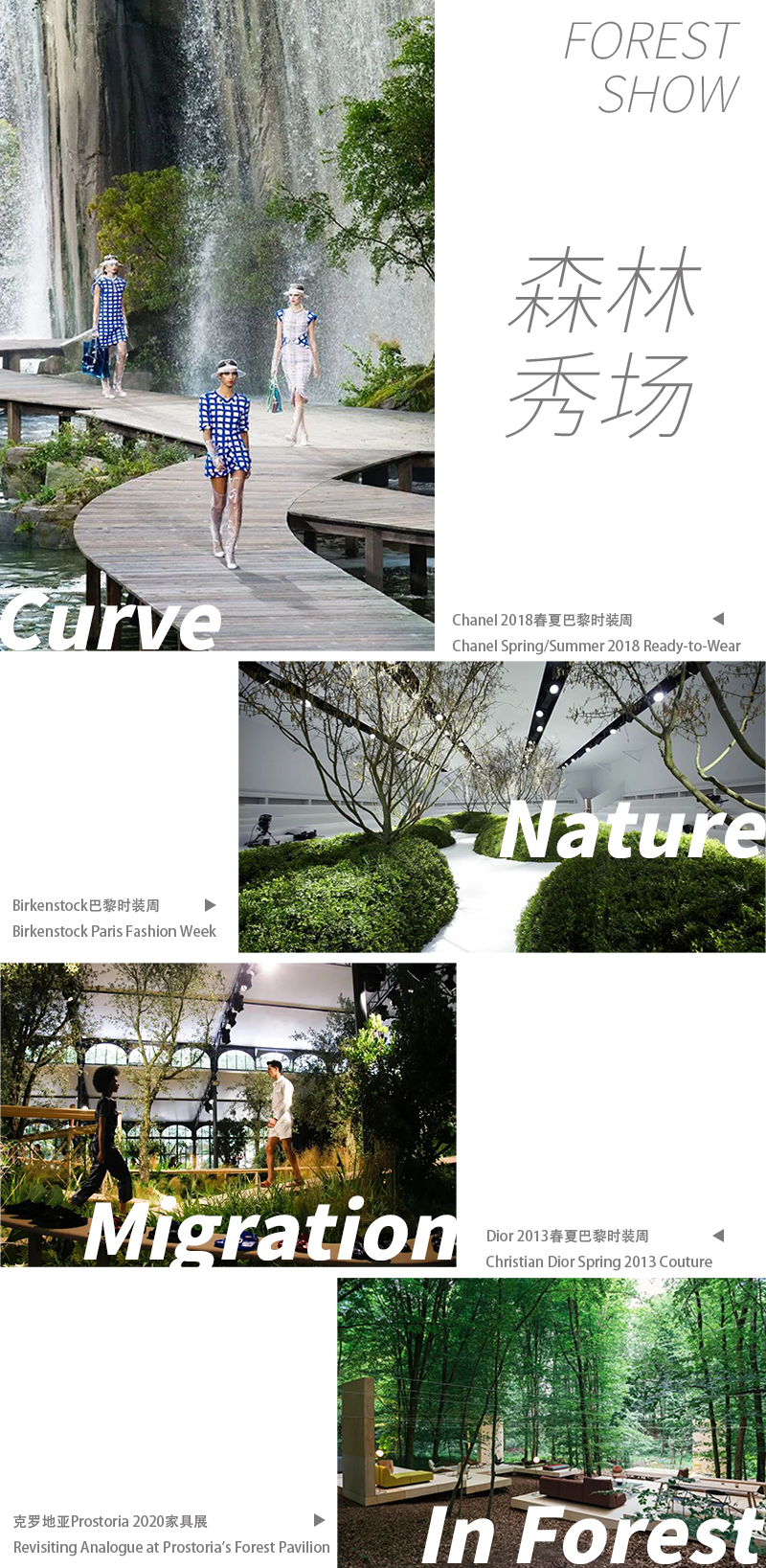 设计运用有机的曲线形式消解了功能主义的局限性和逻辑僵化,将时尚T台的设计元素植入到森林当中,以“森林秀场”为故事线,还原城市里的一片时尚绿洲。
