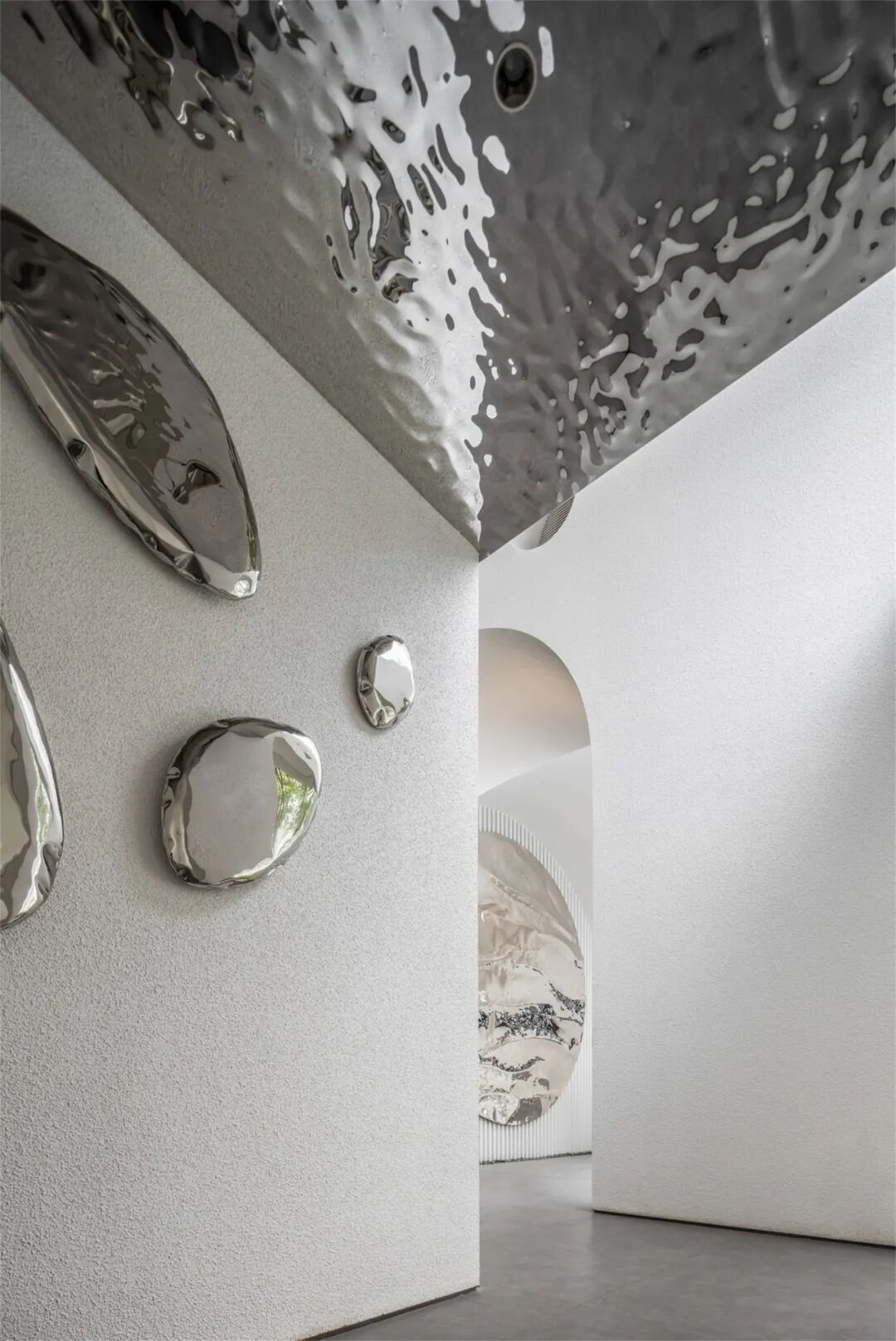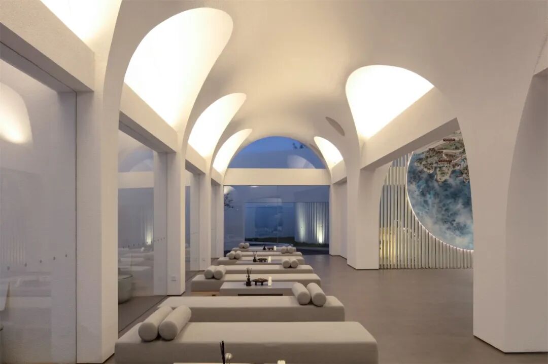 视野越过东向的室外亲水平台,两潭跌落浅水池融进波澜西海和连绵山峦。建筑由外及内,和风景建立深度积极的对话,人在其中感受原始自然的生机和力量。