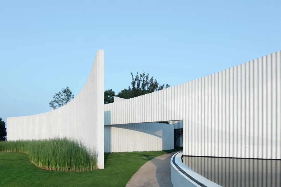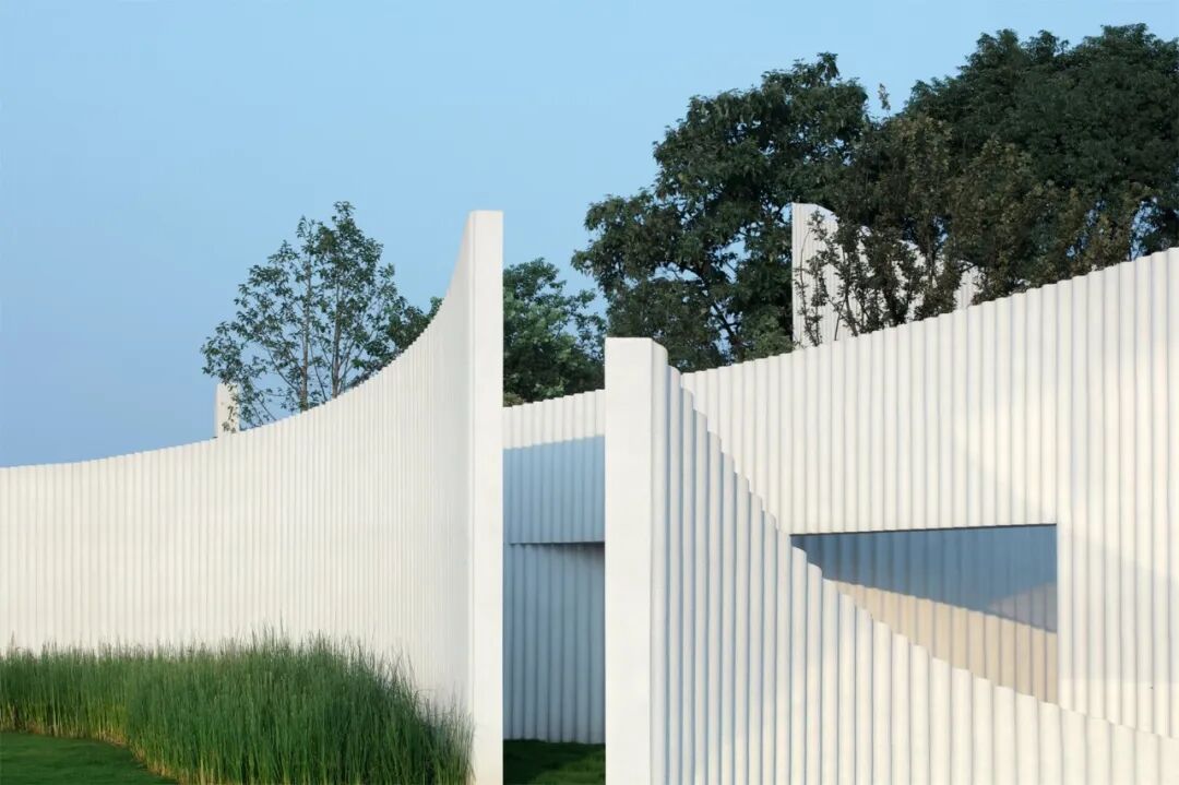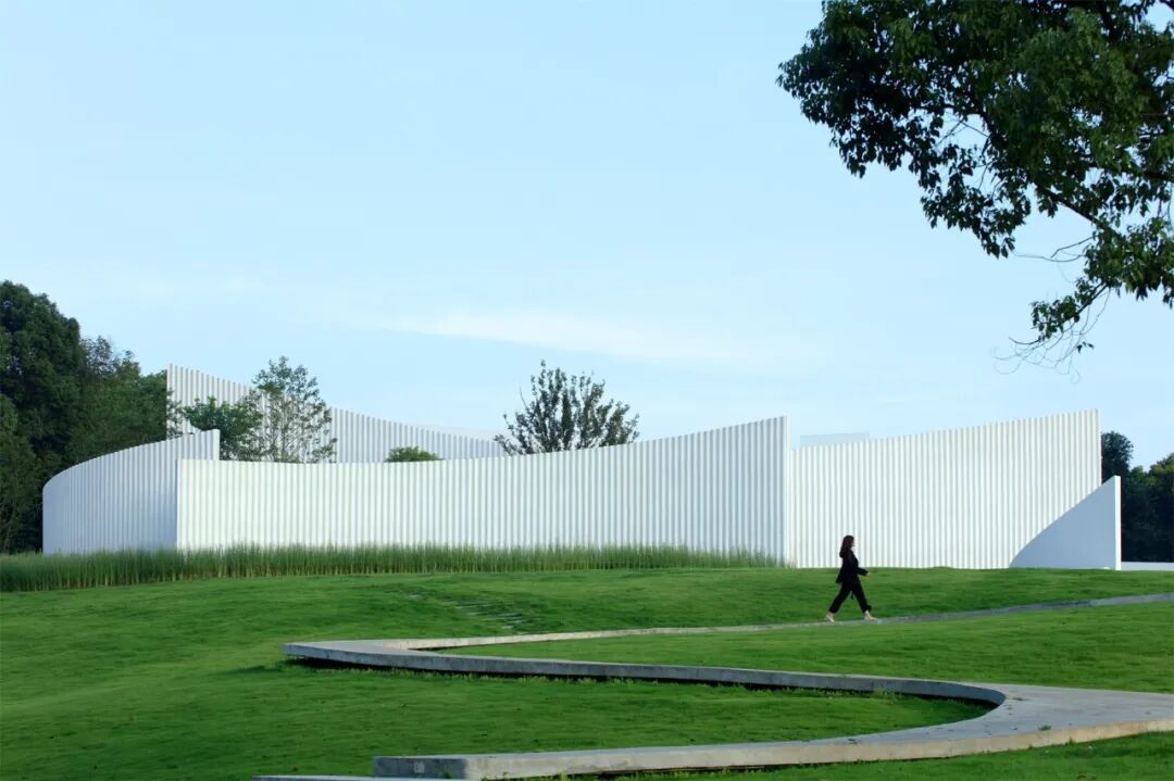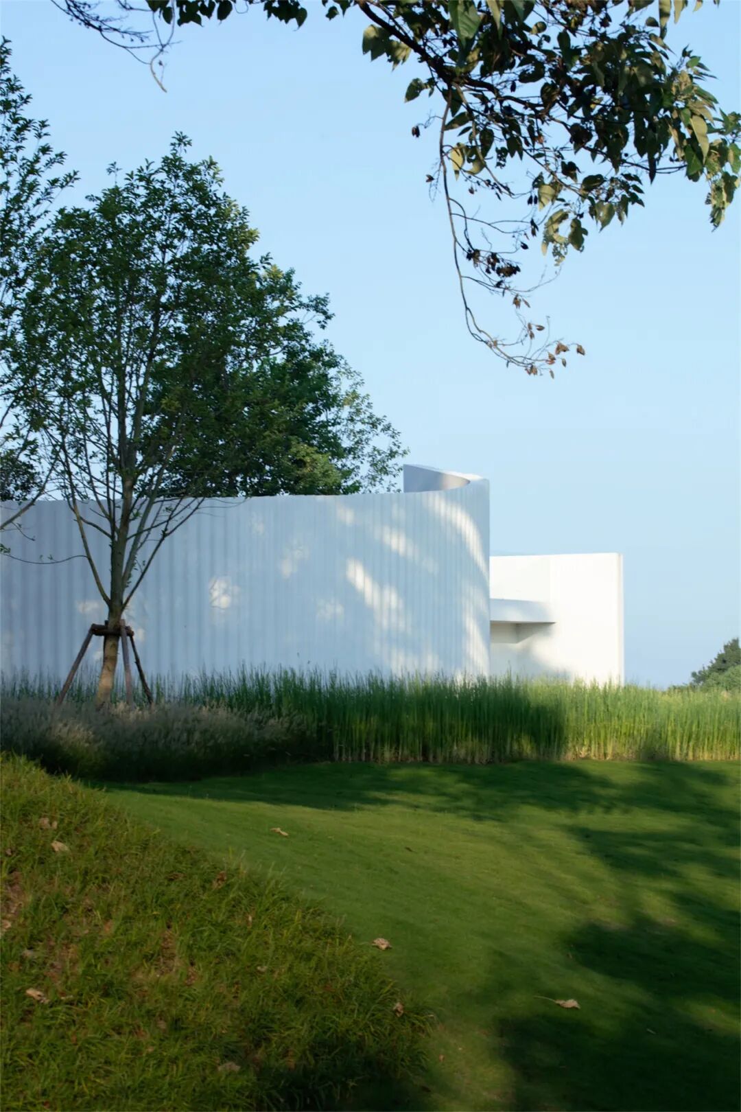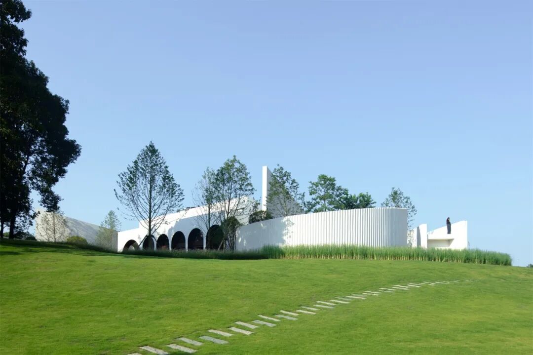 建筑师提取出地景中“脊”线的概念,在场地上勾画婉转流动的结构体,“脊”凸出地形,通过几何语言的简化,共同构建场地的自然之势,波纹肌理应和光影与植被,作为自然的一部分。