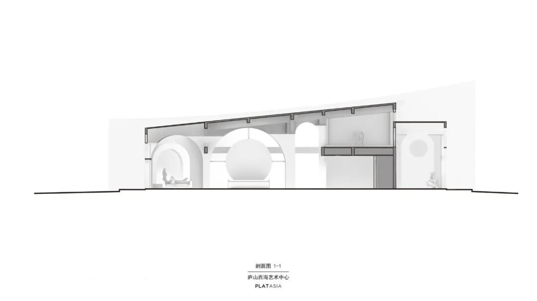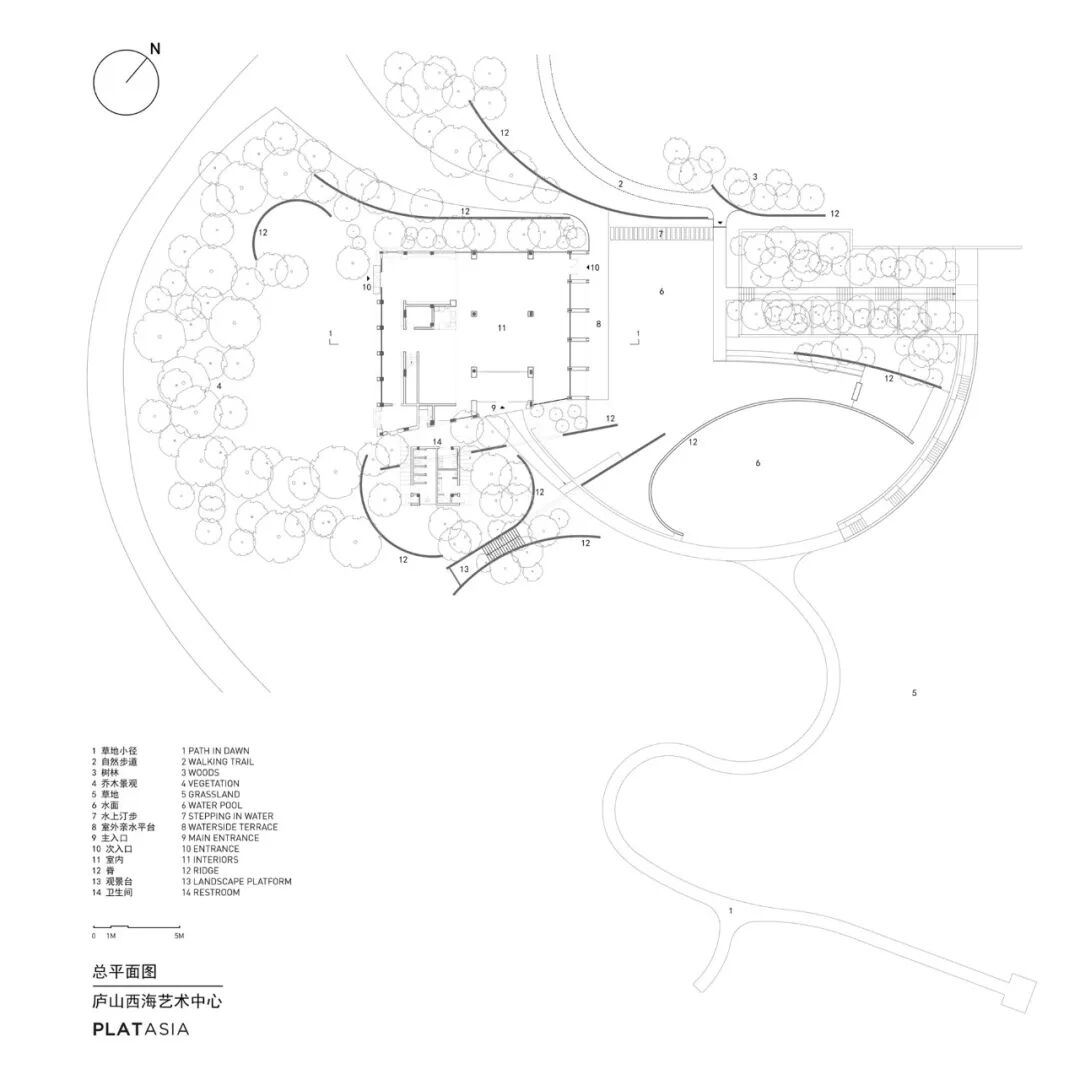 项目位于庐山西海风景区的濒湖草坡上,是集展览、艺术沙龙的多功能文化综合体。委托方起初计划对这处5年未使用的原建筑室内及立面进行改造,建筑师对场地和环境进行分析,提出对场地、建筑、室内进行一体化设计处理,以激活自然湖山风光中原始的生命力,构建场所特有的属性。