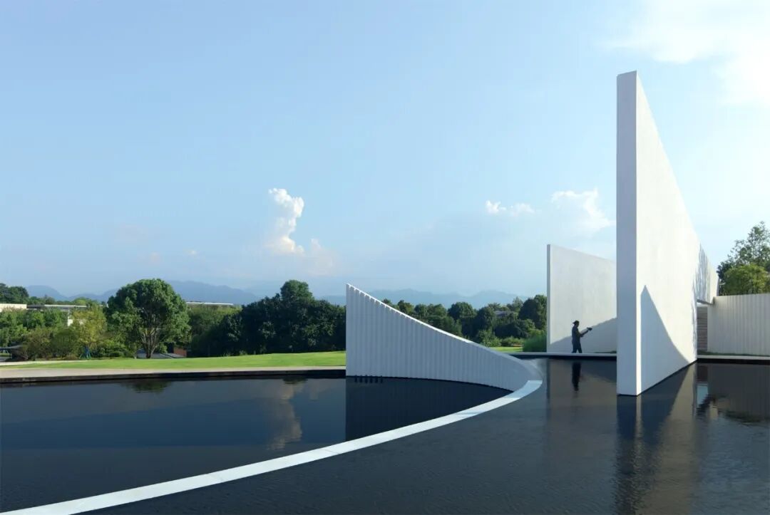 设计从建立自然环境与建筑、人的对话媒介为起点。受场地优越的山水风貌,庐山西海标志性的文化意象,山水画的取材原型等文脉线索启发,感知场地起伏的地势和波涌的湖水。