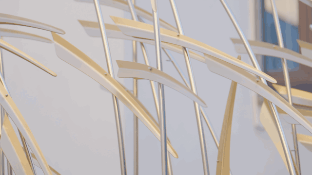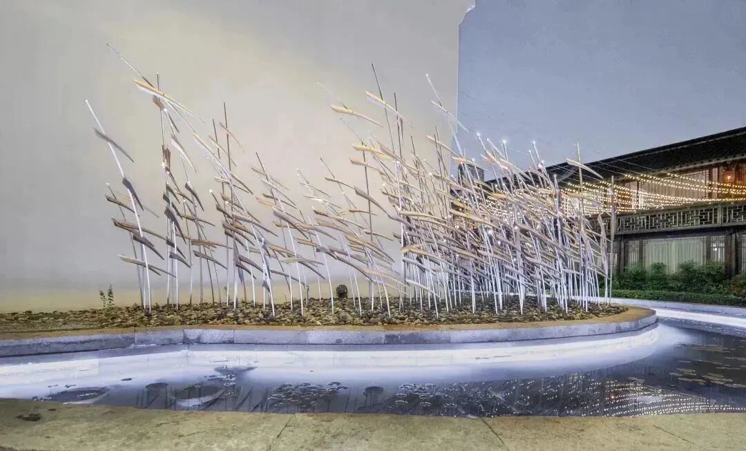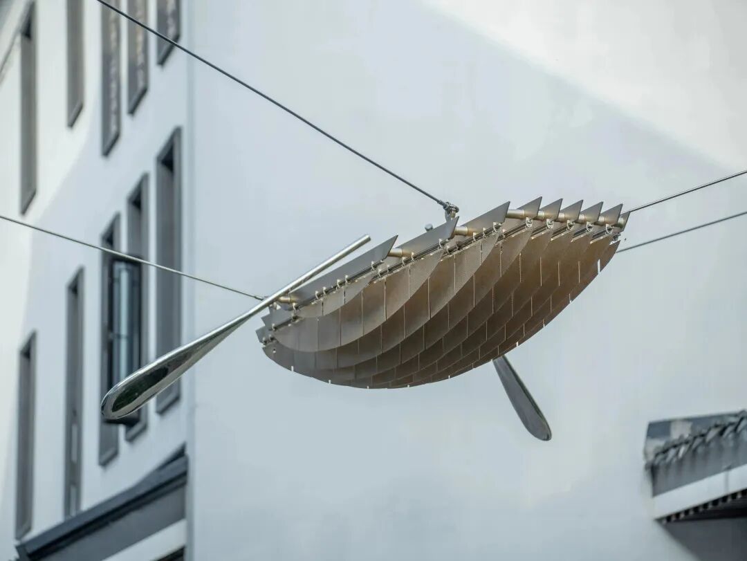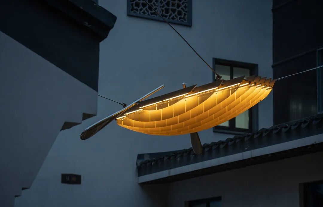香槟金网孔板打造出传统木船的拼接纹理,清风徐来,风动装置的小船捕捉出风的形状,传递出大自然的声音。