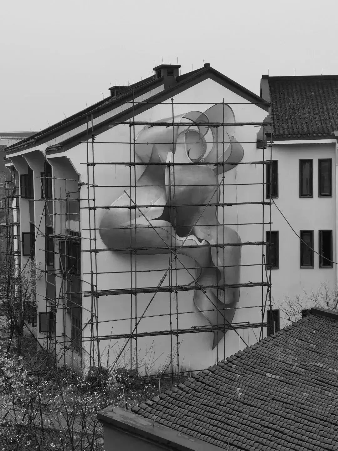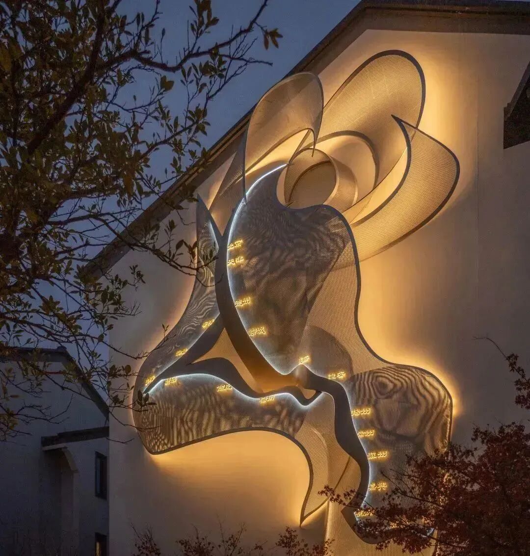 我们从运河的图形中获得灵感,三层结构与两种不同的颜色交叠,不锈钢板镂空出的摩尔纹,配合提取自运河轮廓的抽象图像,运河流水的蜿蜒卷曲跃然墙上。