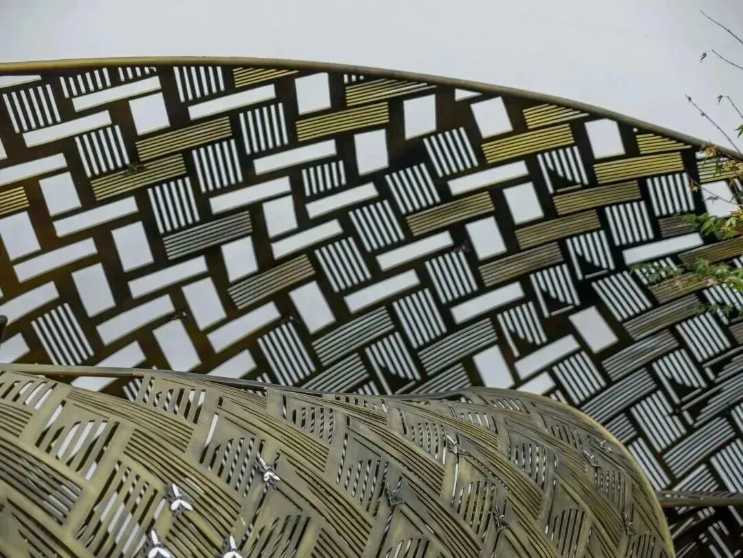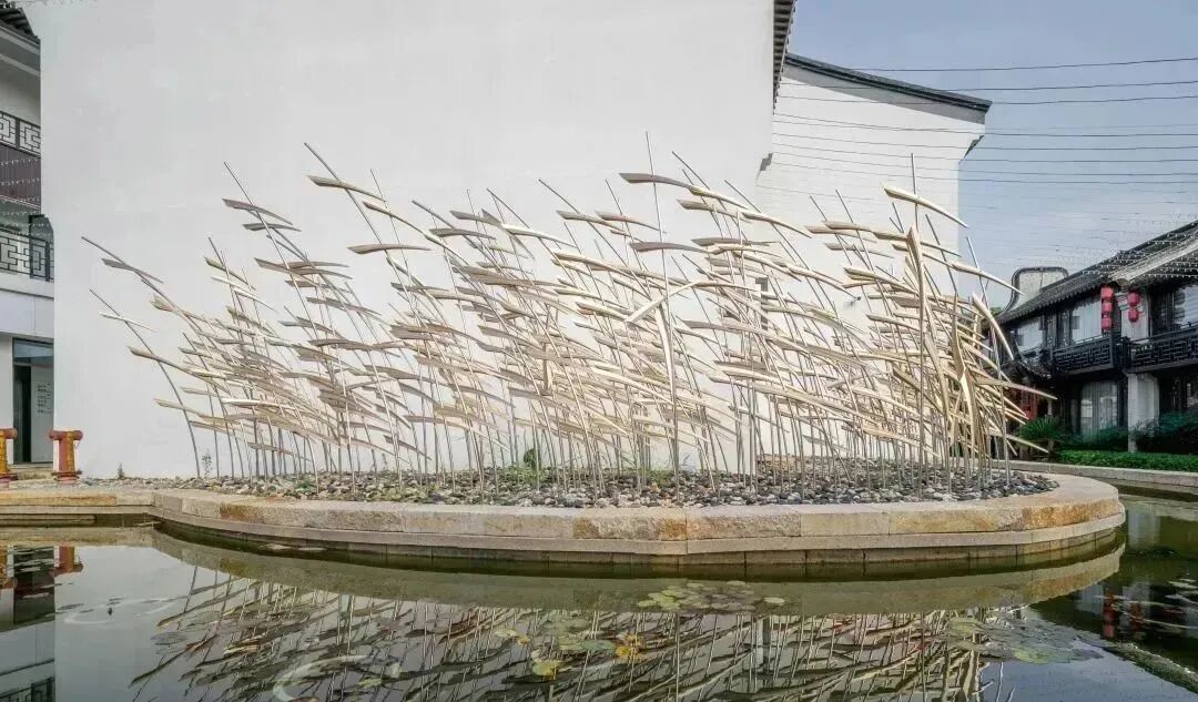 我们用当代艺术来还原非遗文化。以芦席肌理来勾勒古老的编织技艺,用不锈钢仿黄铜材质加镂空设计还原芦席本色。装置内设有风动片,微风吹过,芦席叮当作响,唤醒感官的记忆。