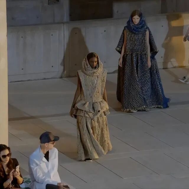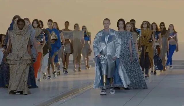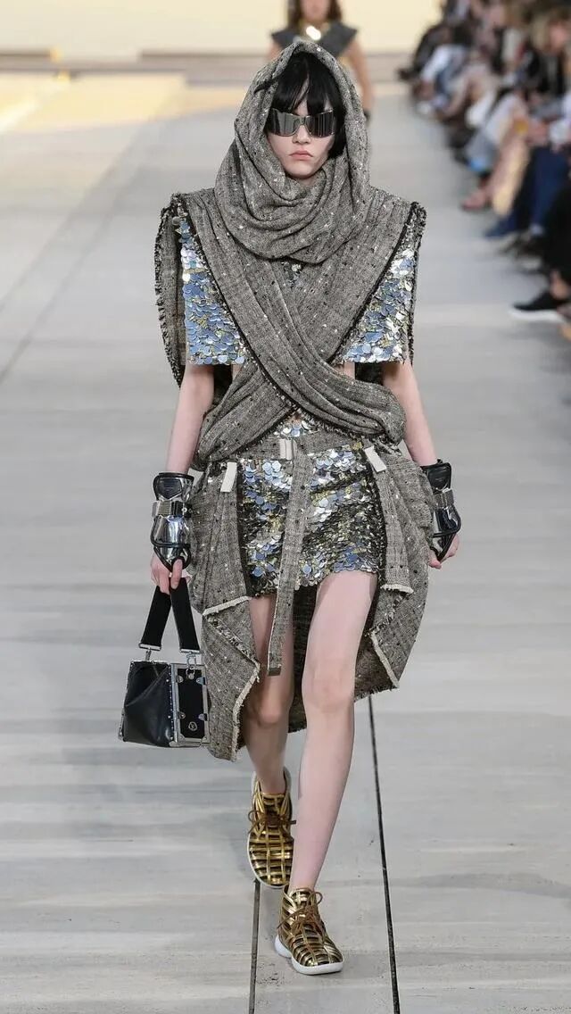 女装艺术总监Nicolas Ghesquière将融合了建筑廓形、流苏装饰、露腹与科技感的三款造型在Louis Vuitton 2023早春度假发布秀压轴呈现,与开场的服装廓形和场地的建筑廓形相呼应。