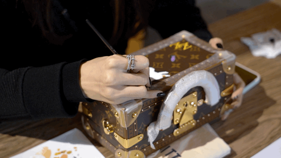 旁边还有手绘师在硬箱上作画,可以根据自己的个性和需求来作画,购买硬箱还可以参与其中设计一下哦。
