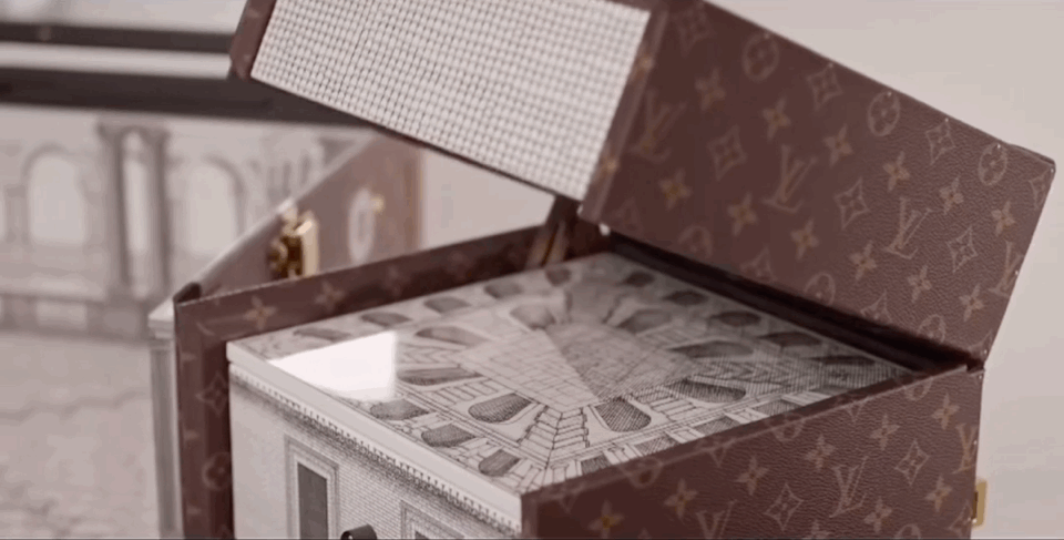 以LV百年传承的硬箱制作工艺,通过精湛手工刻画、细腻木漆印制,呈现出了文艺复兴时期意大利建筑美学氛围。