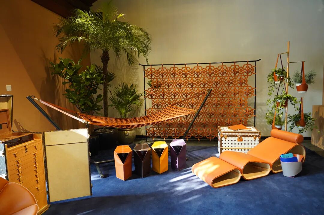 这次,我被这4个不同颜色的折叠凳迷住了。Stool折叠凳,将日本折纸艺术与LV传统旅行箱制作工艺融合在了一起,由瑞士ATELIEROÏ设计工作坊设计,而旁边的棕色吊床也是他们的作品。