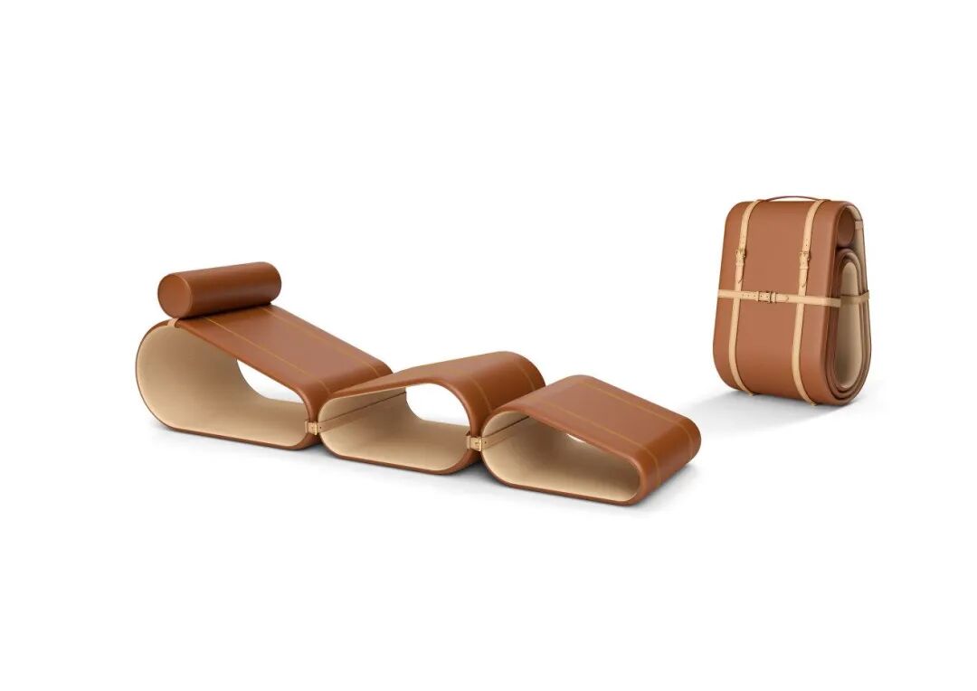 Marcel Wanders 为Objets Nomades系列设计的躺椅创造了一个放松身心的便携绿洲。外形仿若旅行袋,实际上由三个皮革内衬碳纤维模块与一个圆柱形枕垫嵌套而成。通过皮带连接,组成十分舒适的躺椅。三个单独模块如拼图般拼接,当展开时,可成为宽敞舒适的躺椅。